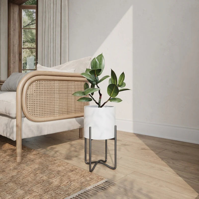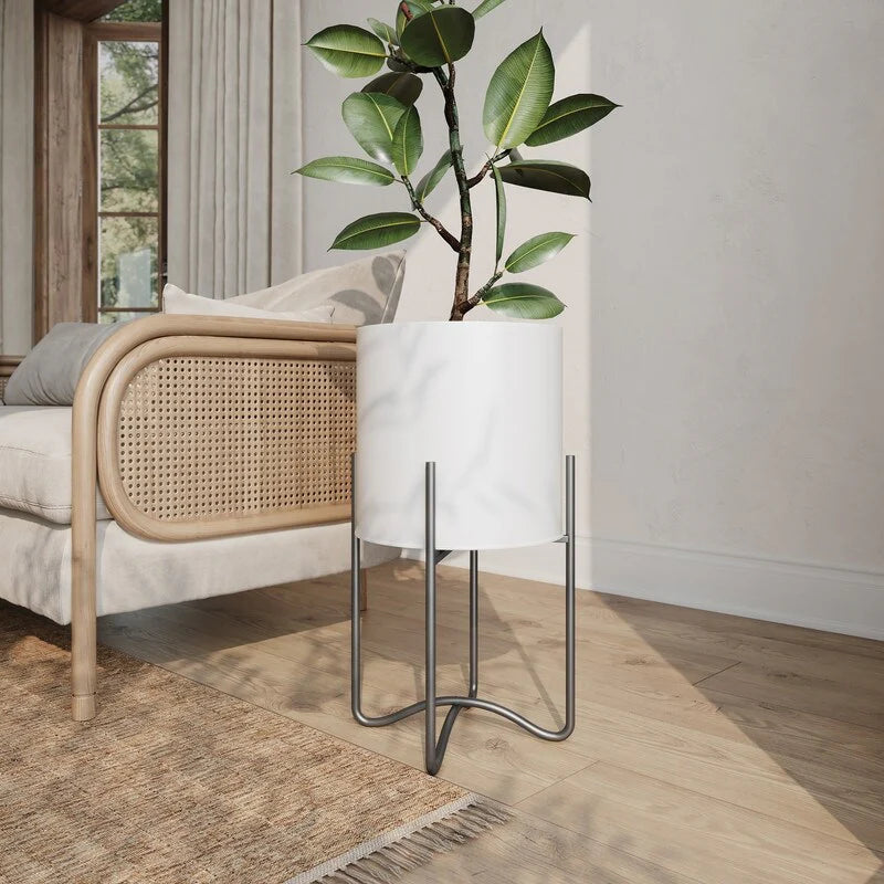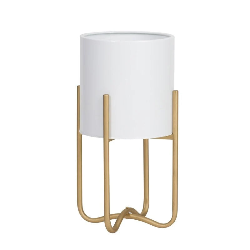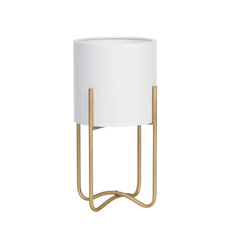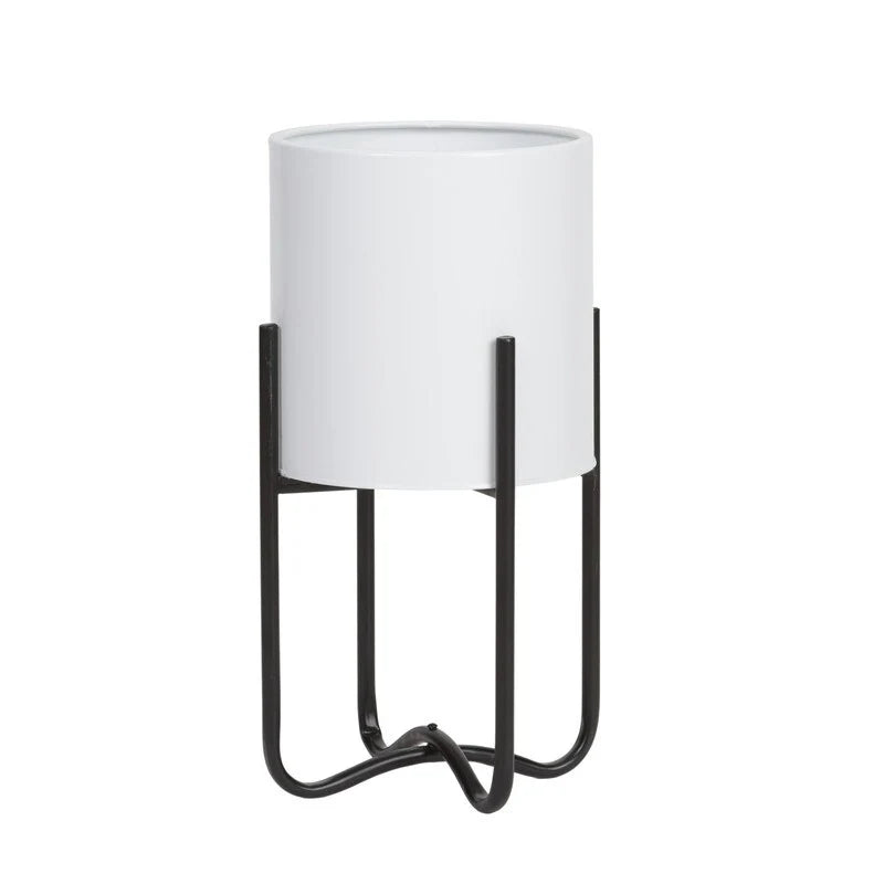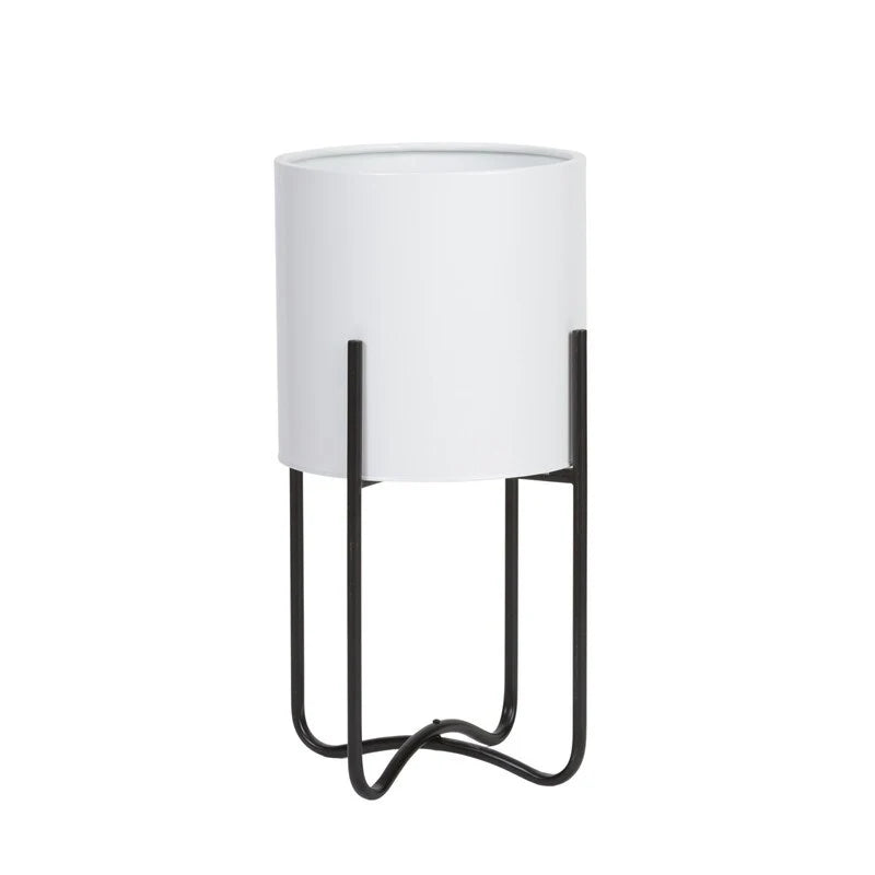 Raya White Mid-Century Modern Indoor Metal Pot Planter with Tall Metal Base