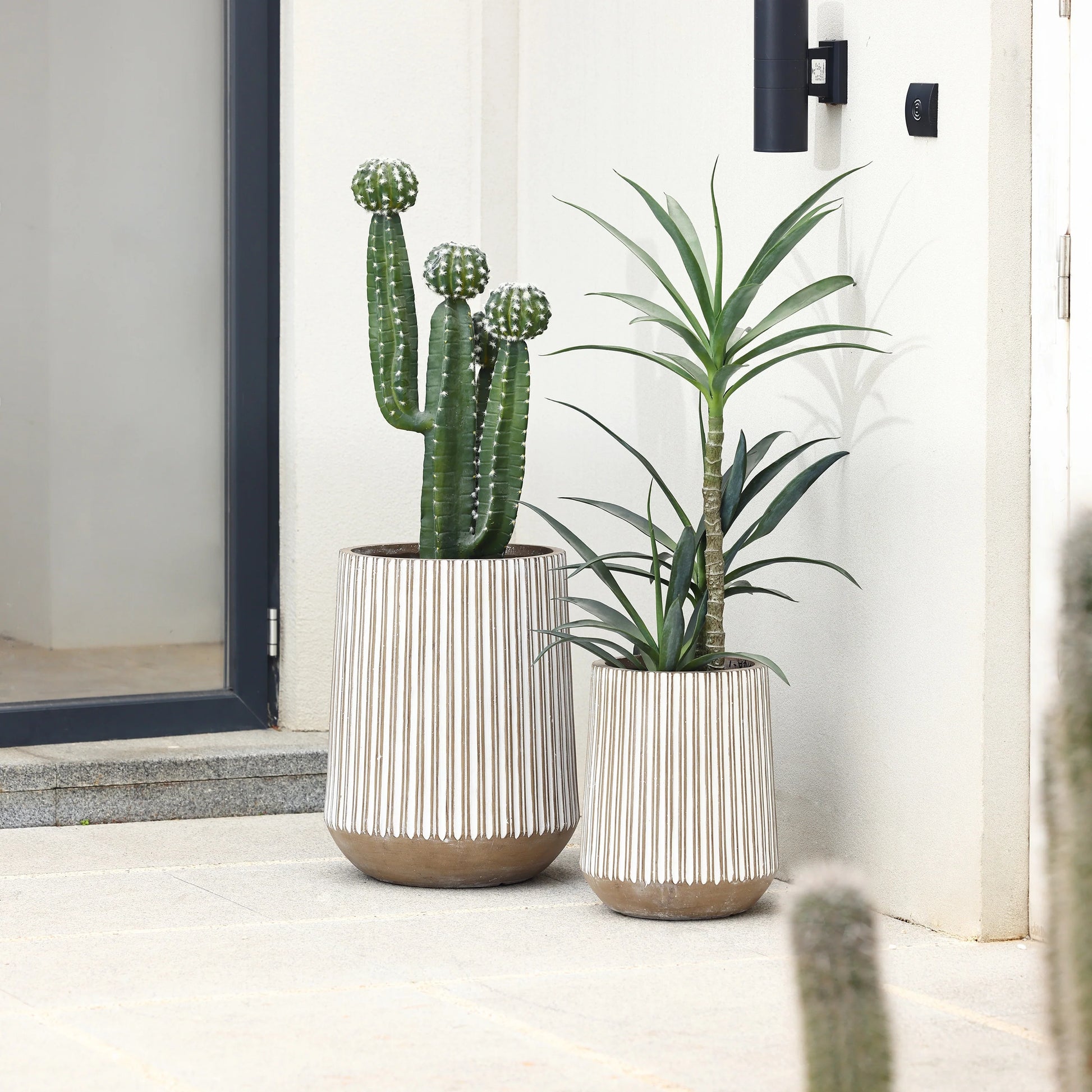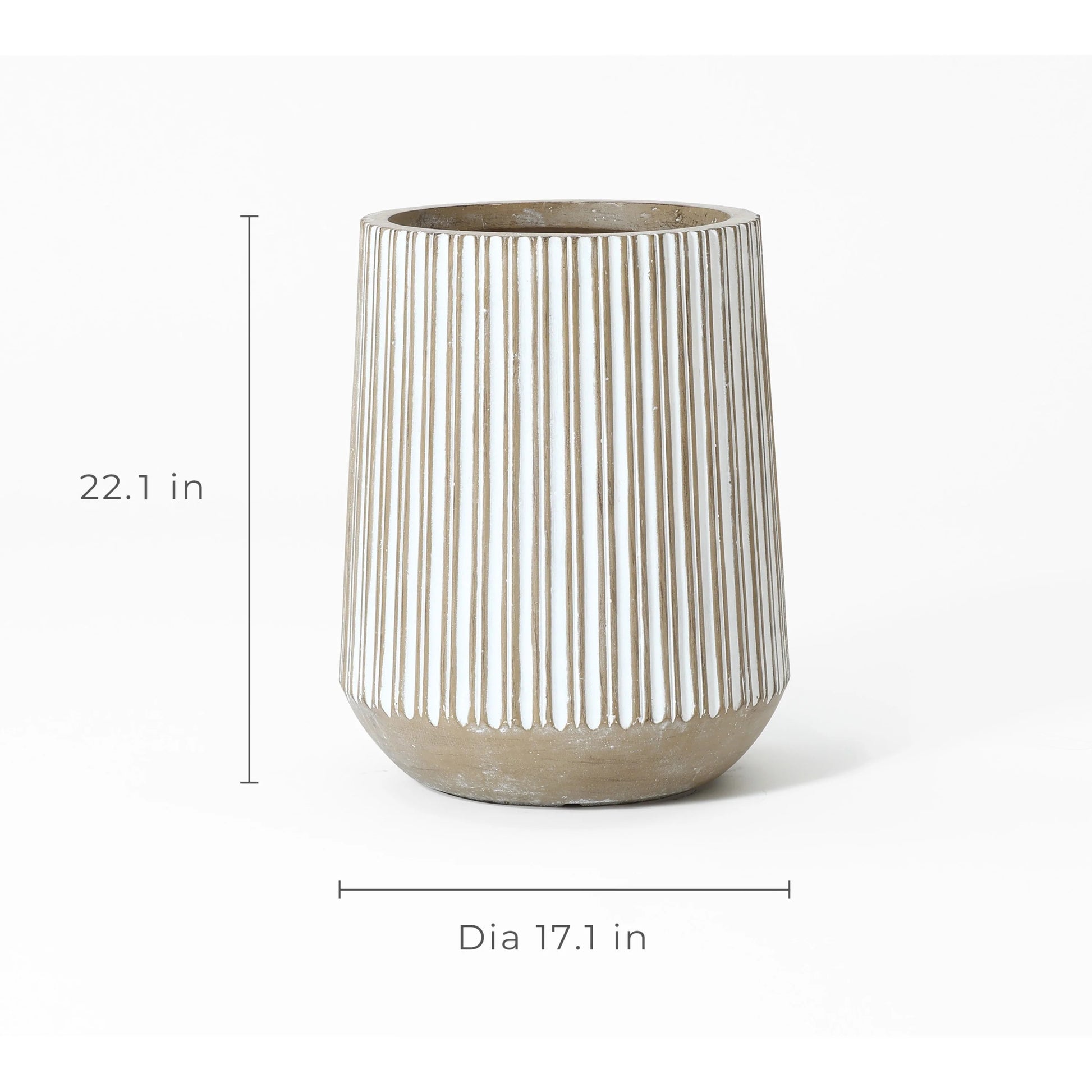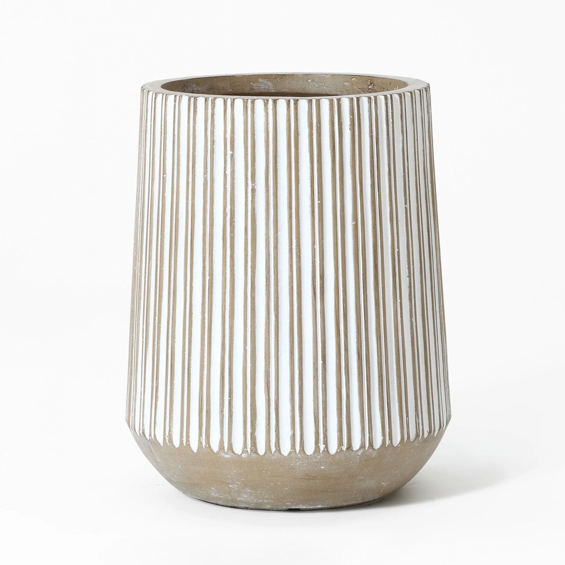 This contemporary-striped planter is the perfect addition to your home! Its unique brown and white design, flared base, and tapered top are sure to catch the eye of anyone who passes by. Whether you choose to place it indoors or outdoors, it will complement and enhance the beauty of its surroundings. Made from durable magnesium oxide, this weather and UV-resistant planter is built to last. The tall, round pot has a drainage hole to prevent over-watering, promote plant health, and encourage healthy growth, and a drainage plug for convenience. It's a beautifully hand-crafted planter perfect for your houseplants, exotic tropical foliage, colorful flowers, or faux plants. Add a touch of elegance to your garden today with this exquisite planter!