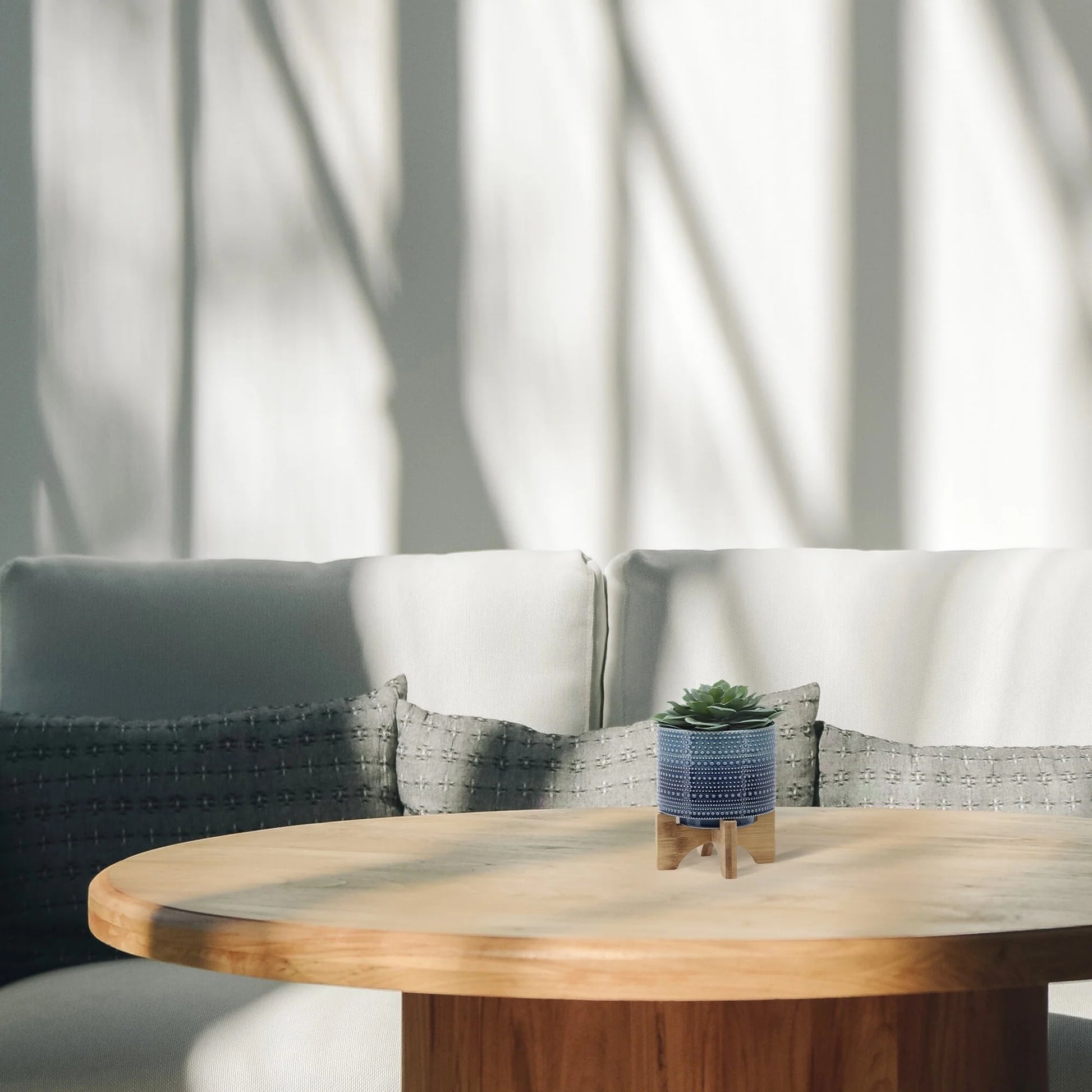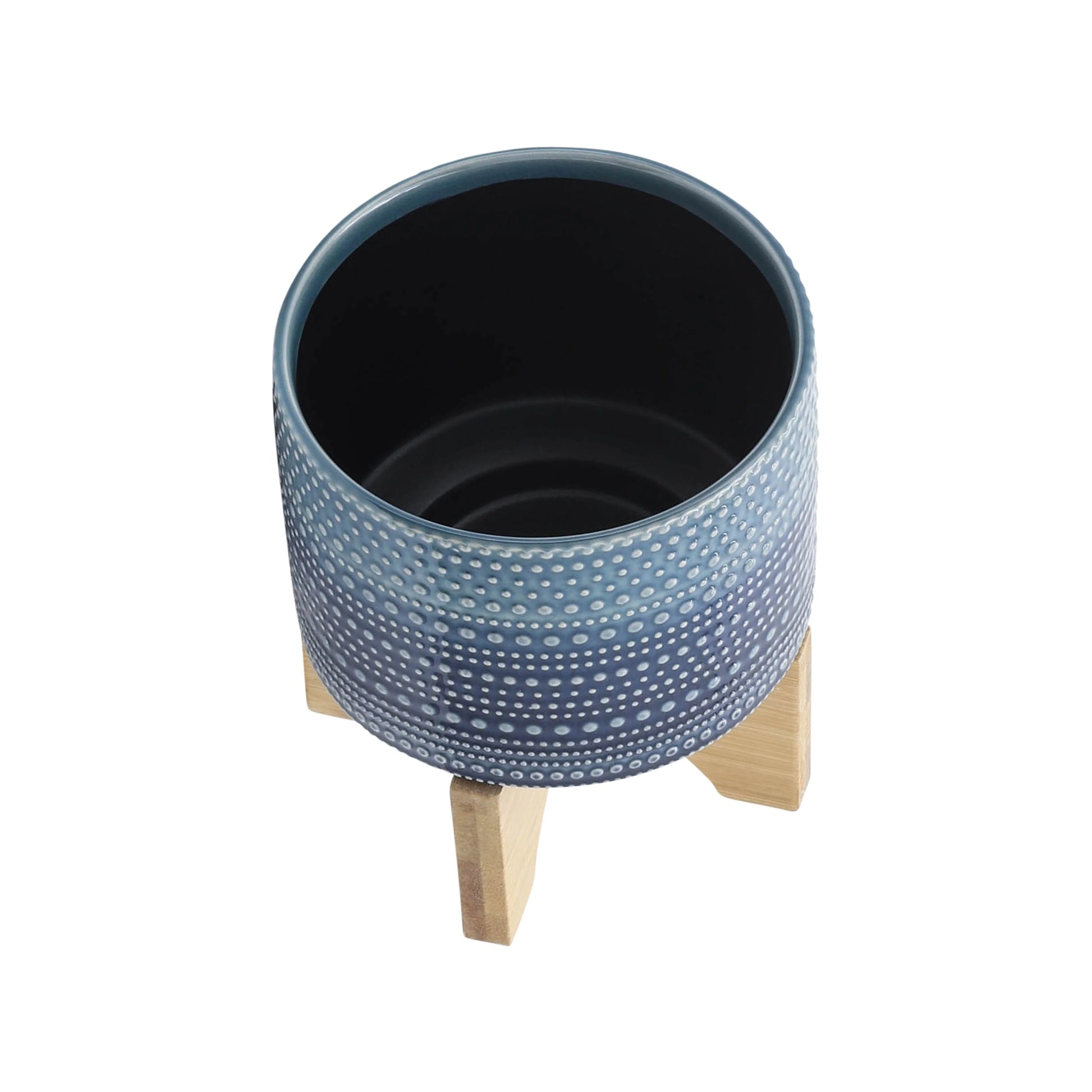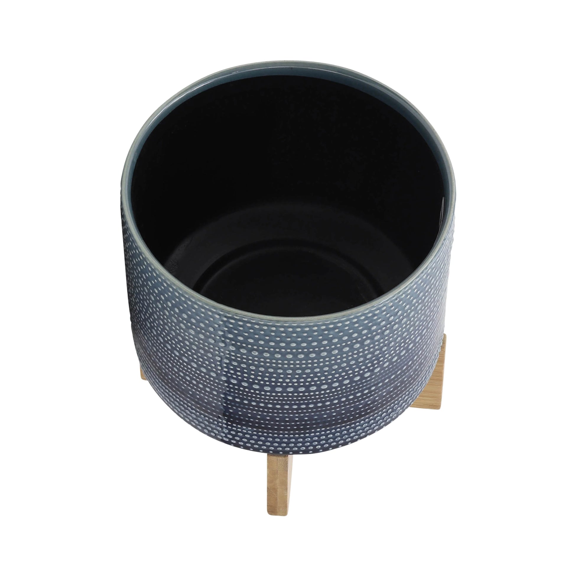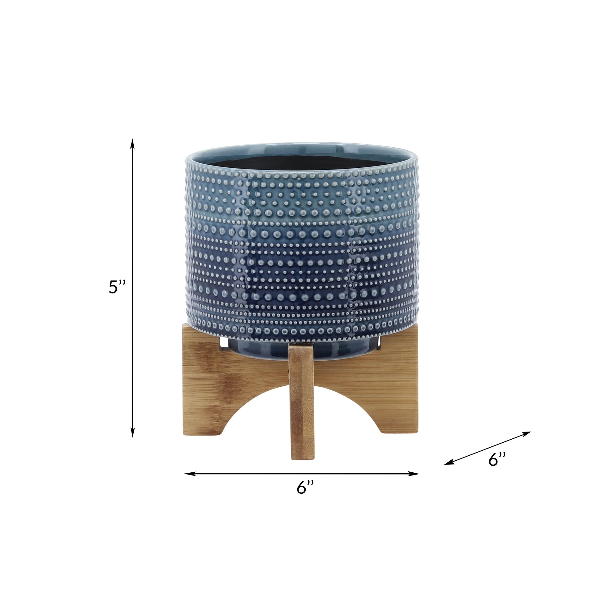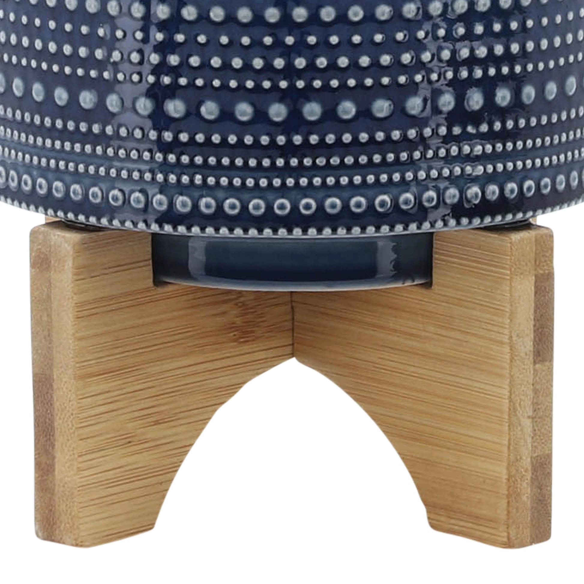 - Contemporary chic decor: This trendy blue dotted ceramic planter with a natural bamboo stand delivers a chic contemporary look that complements any home Decor style.