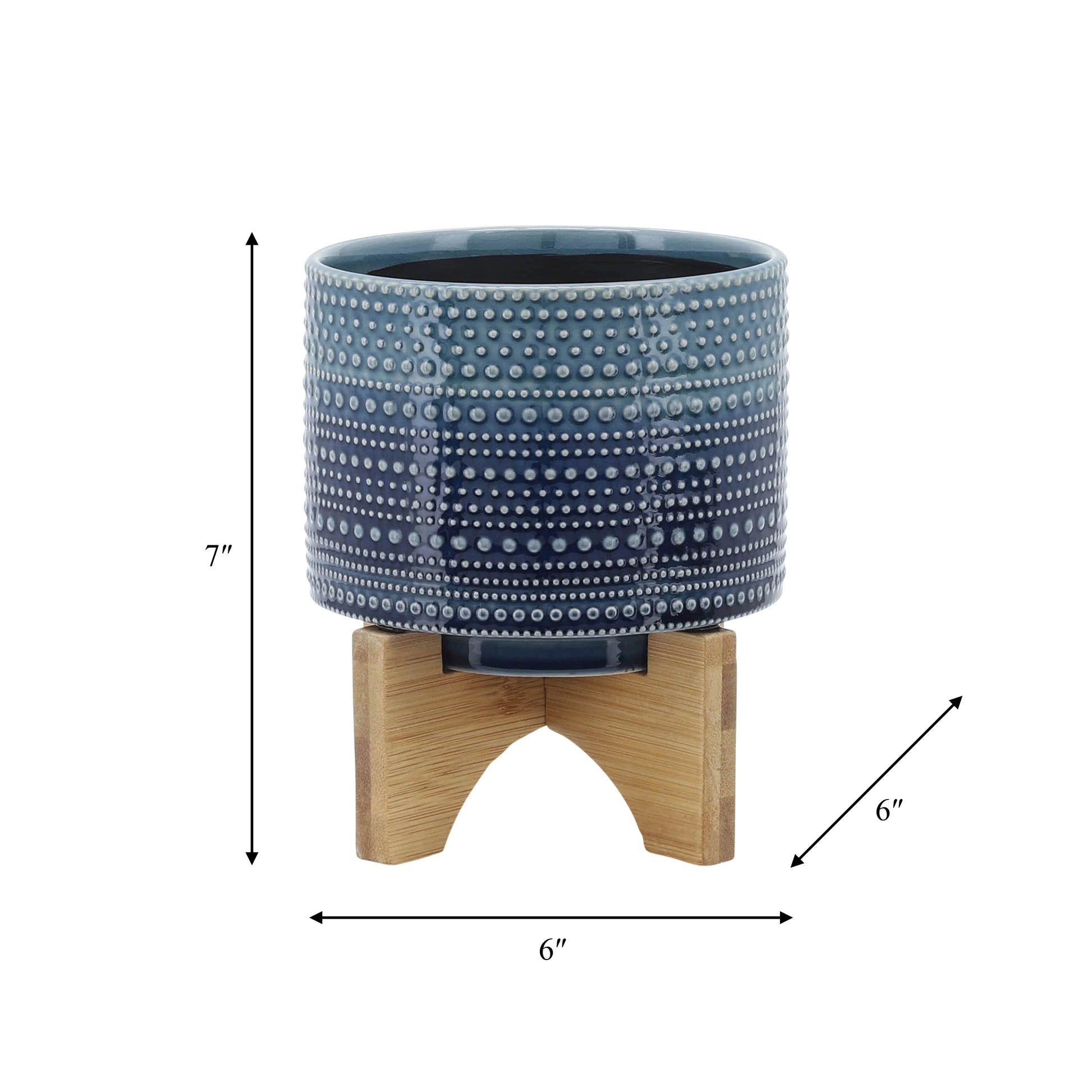 - Textured dot design: This ceramic planter showcases textured rows of dots in various sizes. The planter sits on an elegant bamboo wood base.