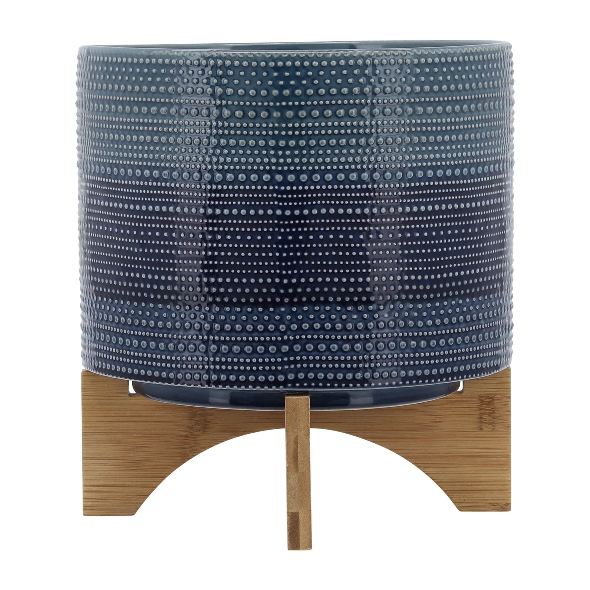The Sagebrook Home Textured Ceramic Planter With Wood Stand makes a chic statement in your contemporary-styled home, office, or patio layout. Made from high-quality ceramic material and decorated with rows of slip trailed dots, the planter sits on a natural bamboo stand. An inset base on the pot lets it sit securely on the crossover wood base. This small planter has no drainage holes, perfect for dropping in a favorite potted plant for a touch of greenery in your home or outdoors on your patio or veranda.