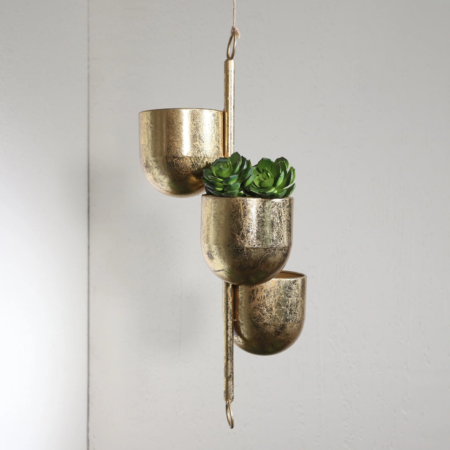 - This high quality hanging planter is a solid metallic gold color. It consists of three small planters that alternate sides for an eye-catching home for your succulents and other small plants.