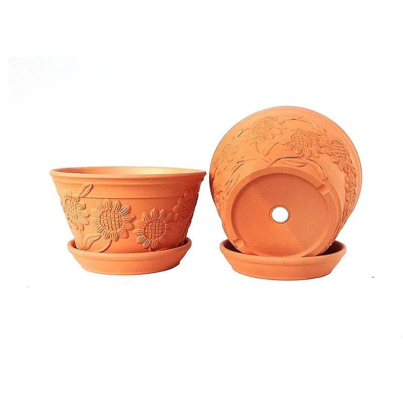 Set of 2 Sunflower Terracotta Garden Pot with Individual Tray, 2 SIZES