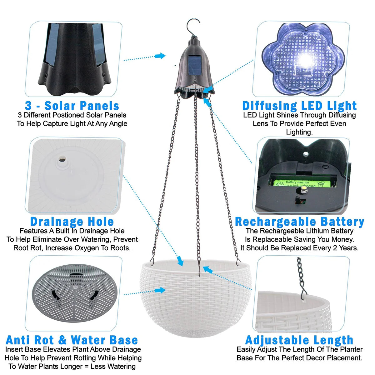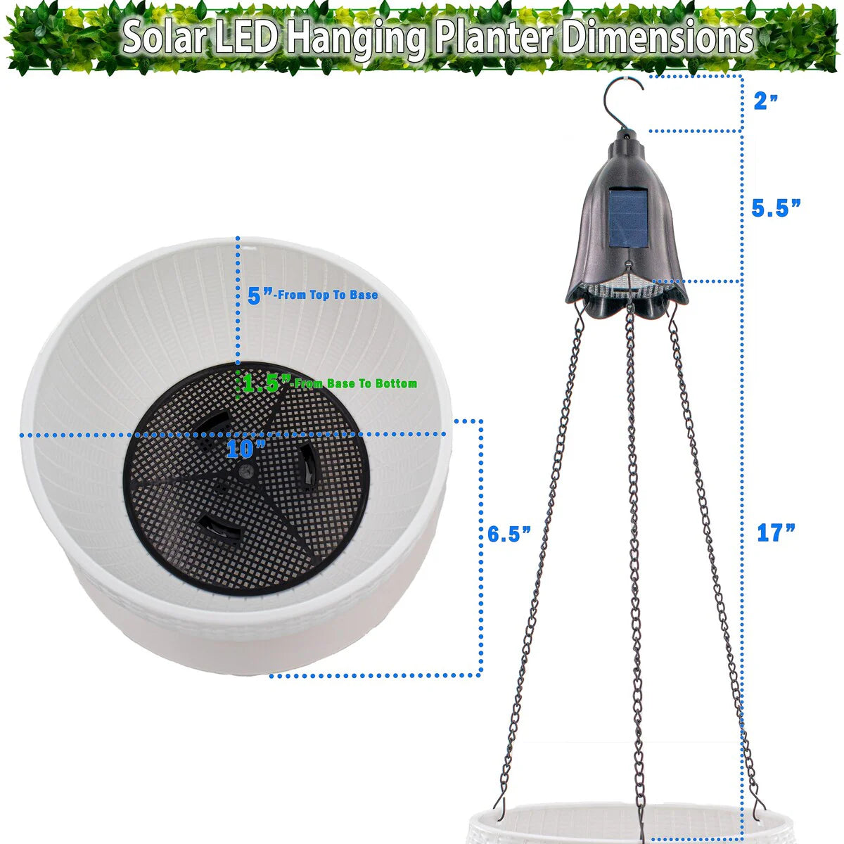 Seamless Plant Care with our Versatile Solar LED Hanging Planter Experience the profound transformation of your green space with our energy-efficient solar LED planter. This enchanting product bathes your indoor herbs or outdoor blossoms in a soft, evenly diffused glow, thanks to its three solar panels capturing sunlight from any direction. As dusk settles, the automated lights spring to life, creating a mesmerizing ambiance that enhances the allure of your foliage.
