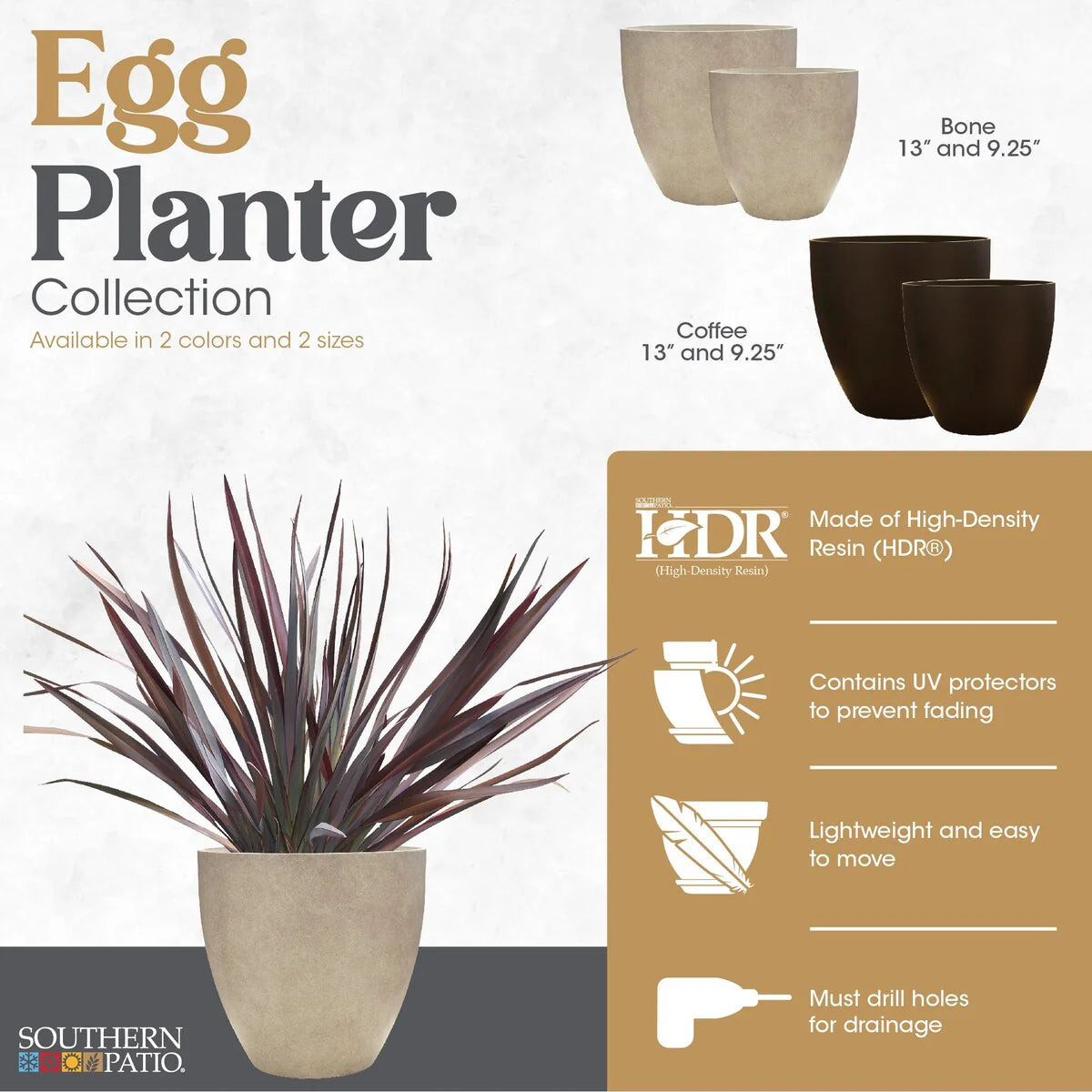 Bring a touch of elegance to your garden with the Southern Patio Egg Planter. This curvy, egg-shaped planter is perfect for planting your favorite flowers and greenery. Its smooth surface makes cleaning a breeze, while the UV-coated finish ensures bright colors that last all year round. Crafted from heavy-duty plastic, this planter is resistant to cracking and harmful UV rays. For outdoor use, be sure to drill a drainage hole in the bottom. With a 30-day limited warranty, you can enjoy this planter worry-free.
