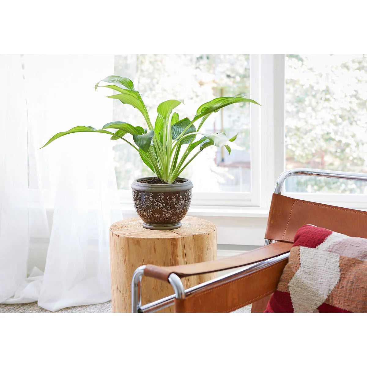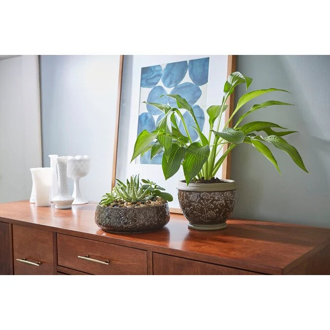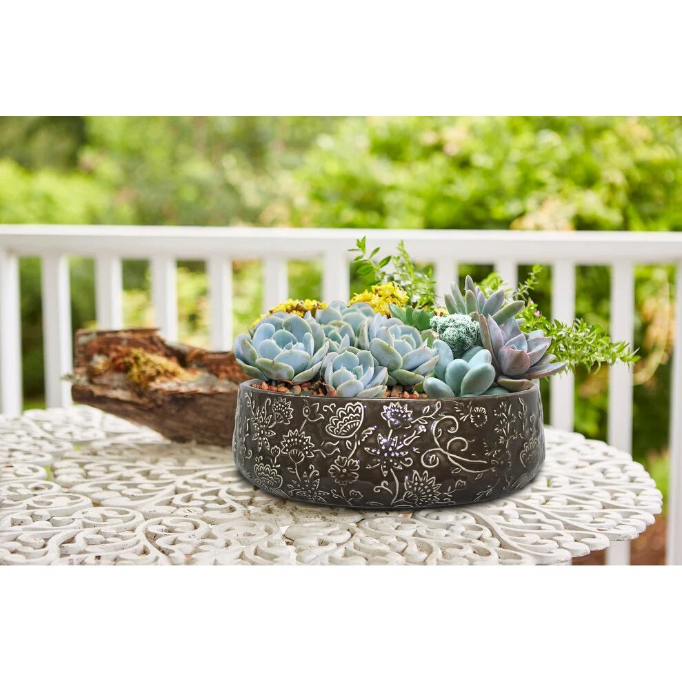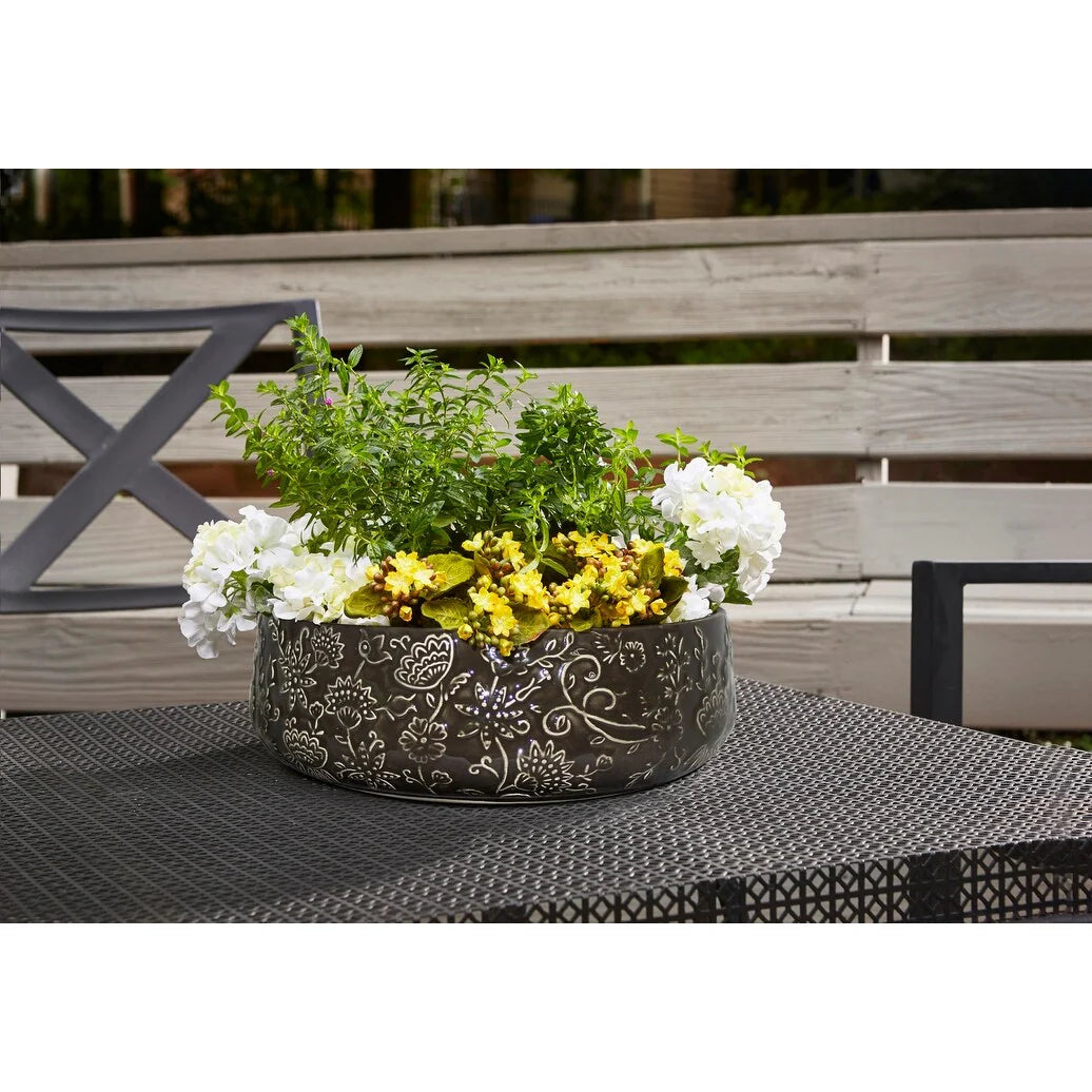 Bring a touch of elegance to your indoor or outdoor space with the Gracie planter by Southern Patio. This high-quality ceramic planter has a beautiful glossy finish and is decorated with intricate floral embossing. Show off your blooming flowers or hardy succulents in this stunning pot that is both functional and stylish.