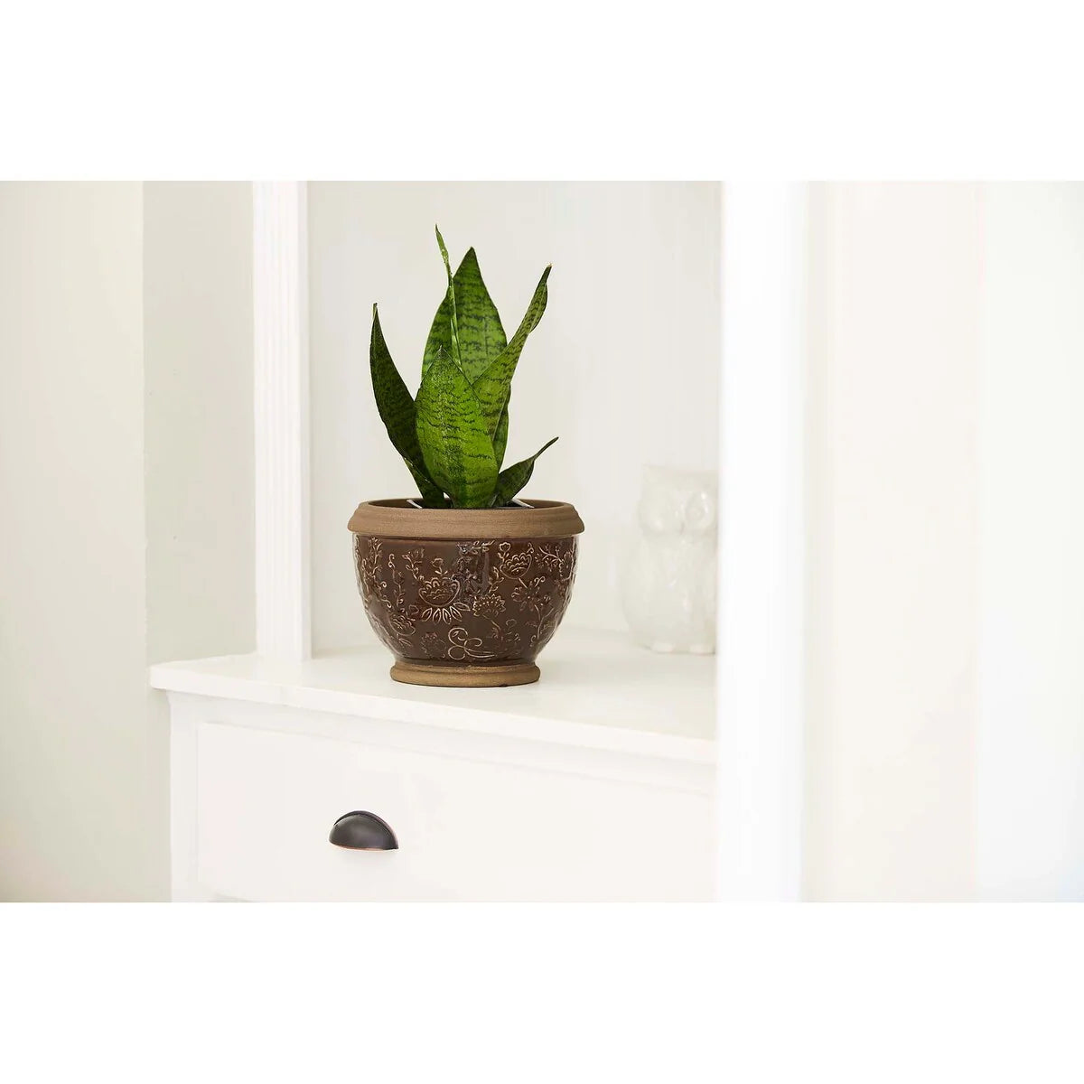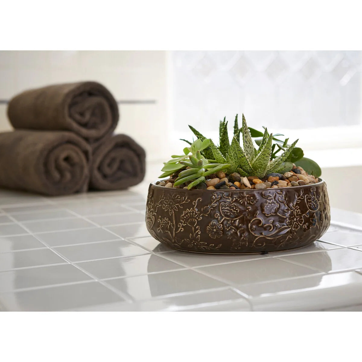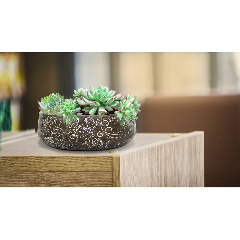 Bring a touch of elegance to your indoor or outdoor space with the Gracie planter by Southern Patio. This high-quality ceramic planter has a beautiful glossy finish and is decorated with intricate floral embossing. Show off your blooming flowers or hardy succulents in this stunning pot that is both functional and stylish.