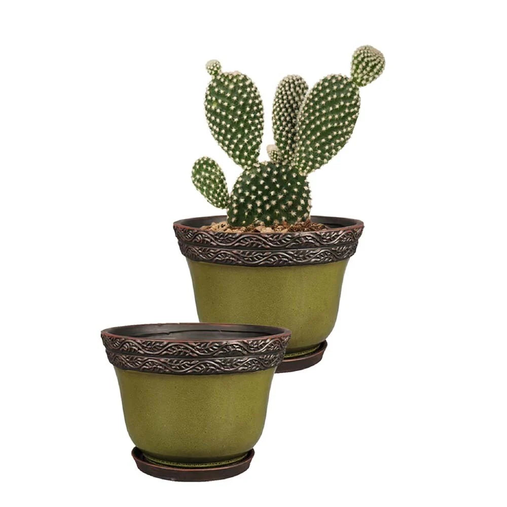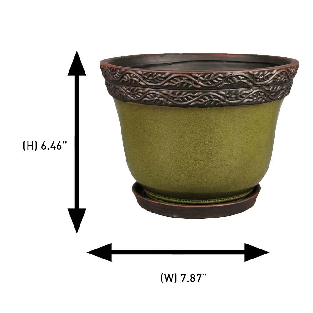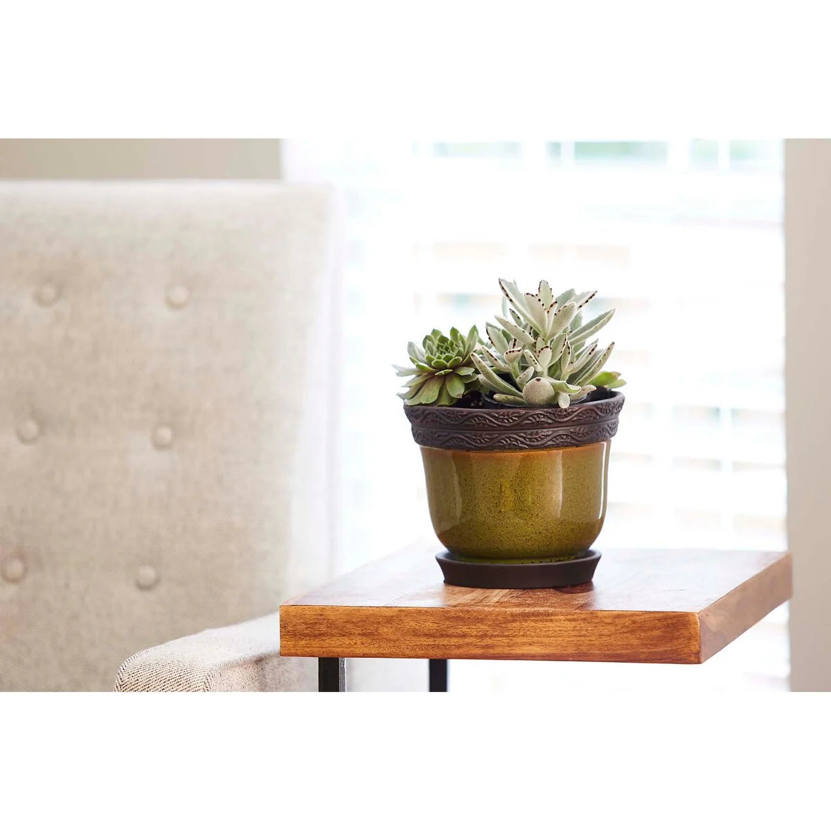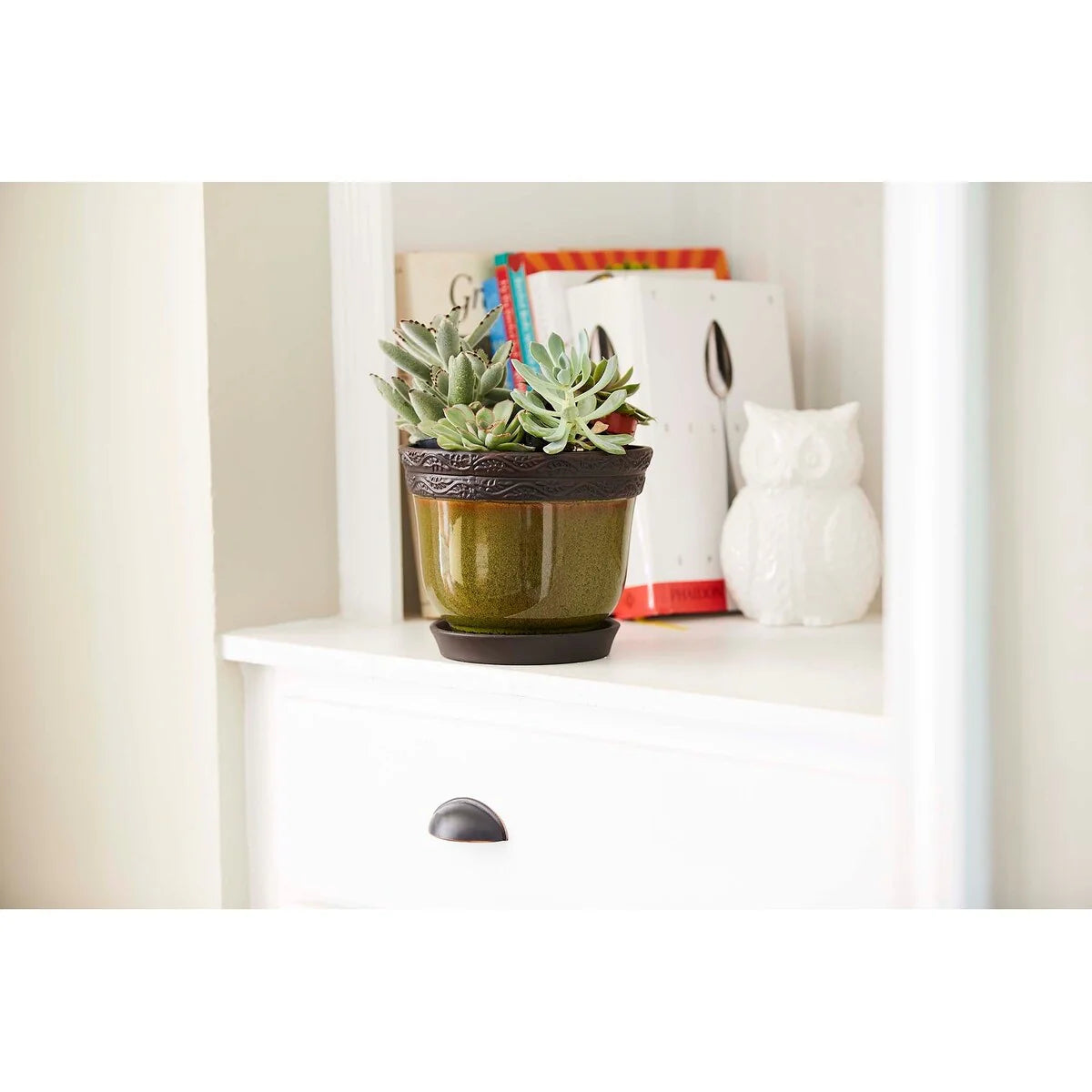 Bring a touch of natural elegance to your indoor space with the Southern Patio Reserva Planter. With its glossy, earth-toned finish, contrasting bronze trim, and decorative floral embossing, this hand-crafted ceramic planter adds simple yet stunning beauty to any room. This planter is perfect for showcasing your favorite bright, blooming florals or hardy succulents and is available in two sizes to fit any space.