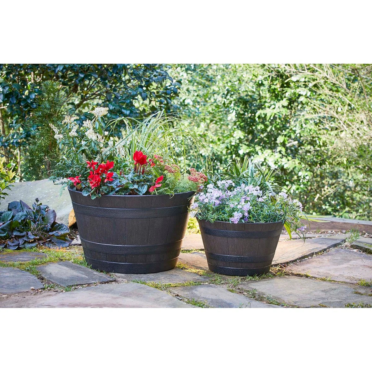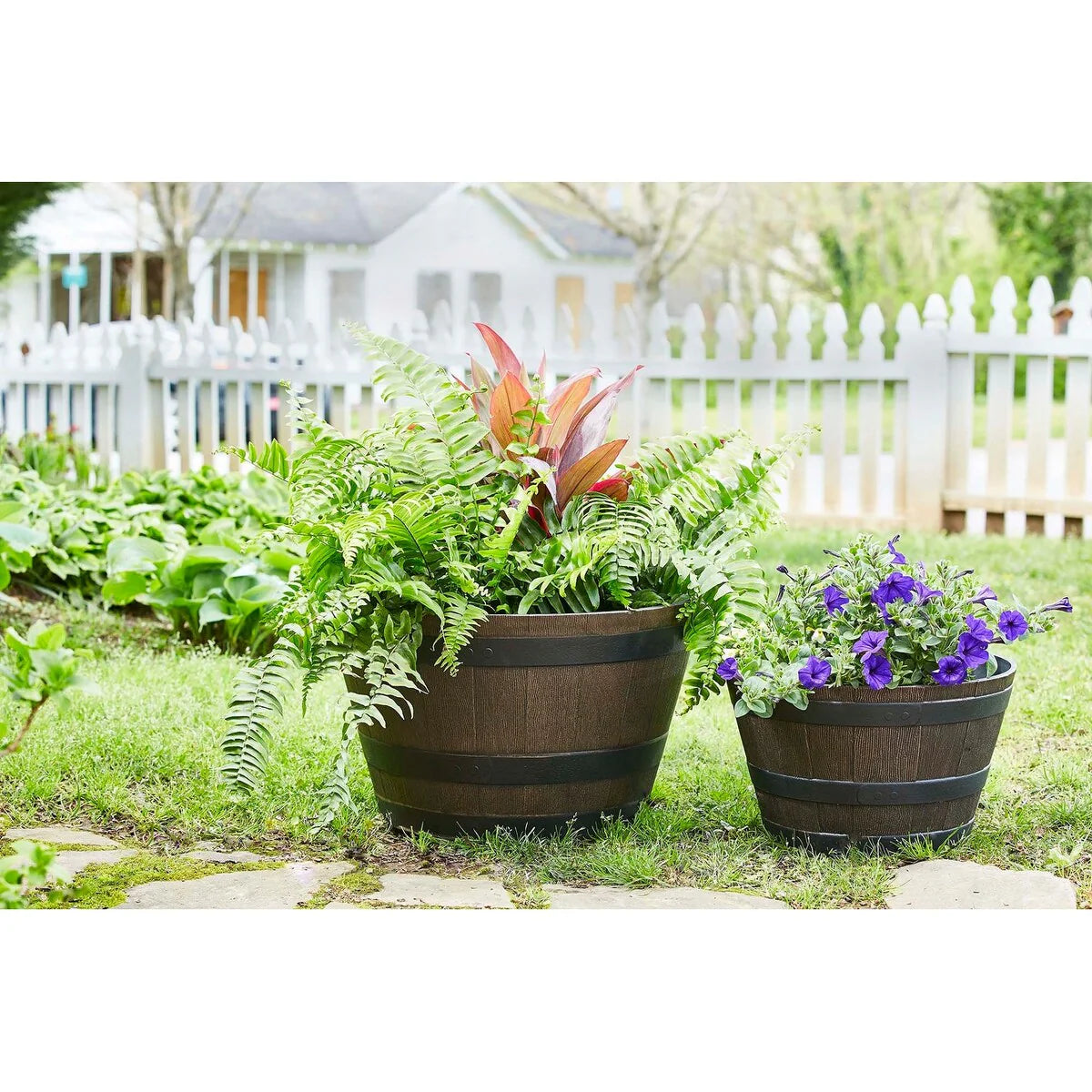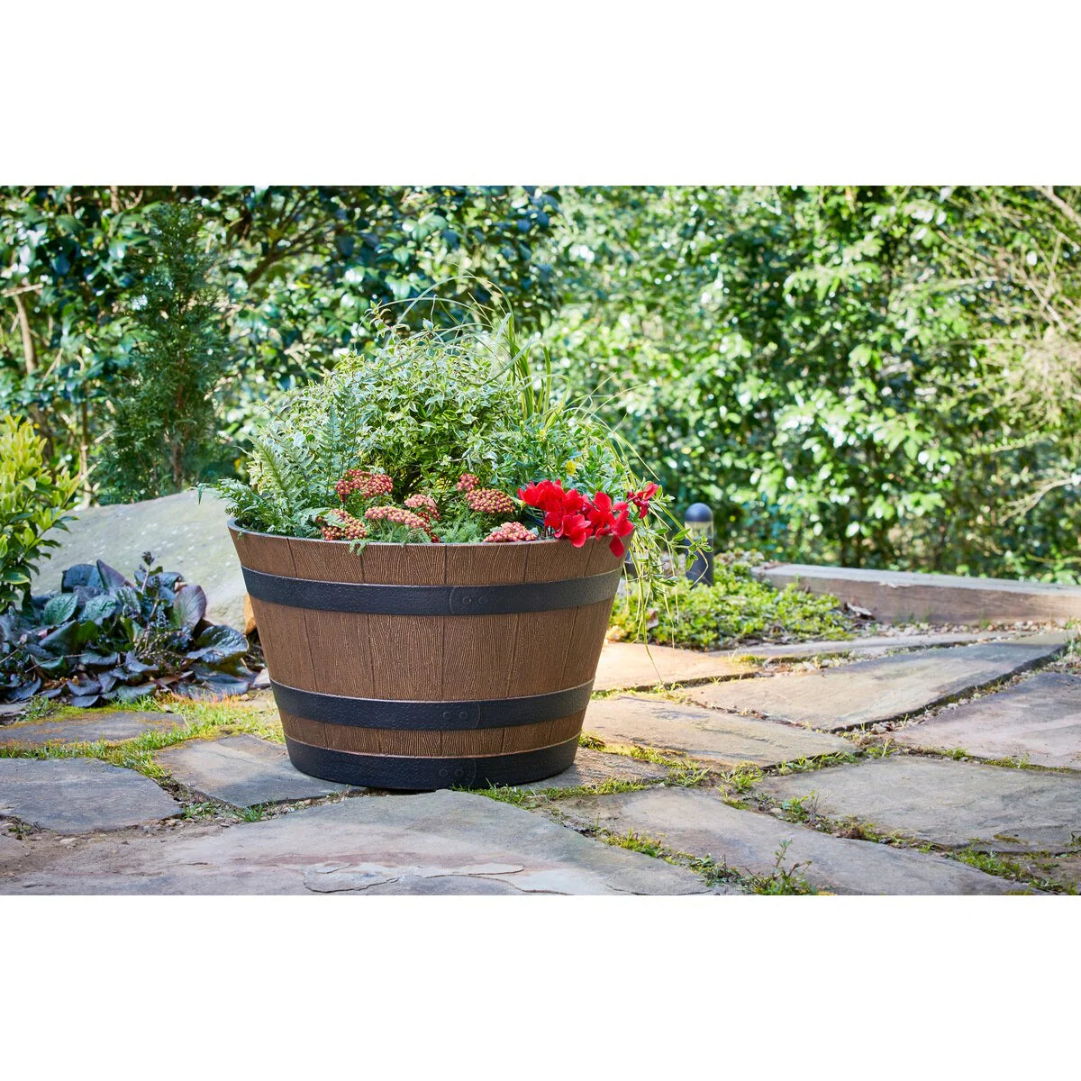 Create a cozy, country look with this whiskey barrel planter. Made from durable plastic, the fade and crack-resistant frame features a slatted design. Choose from two finishes and three sizes to fit your favorite flowers and plants.