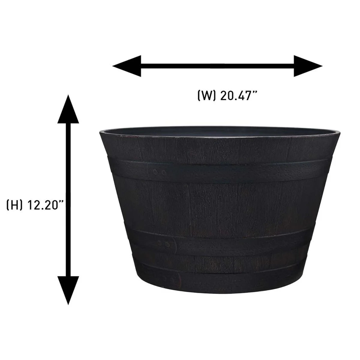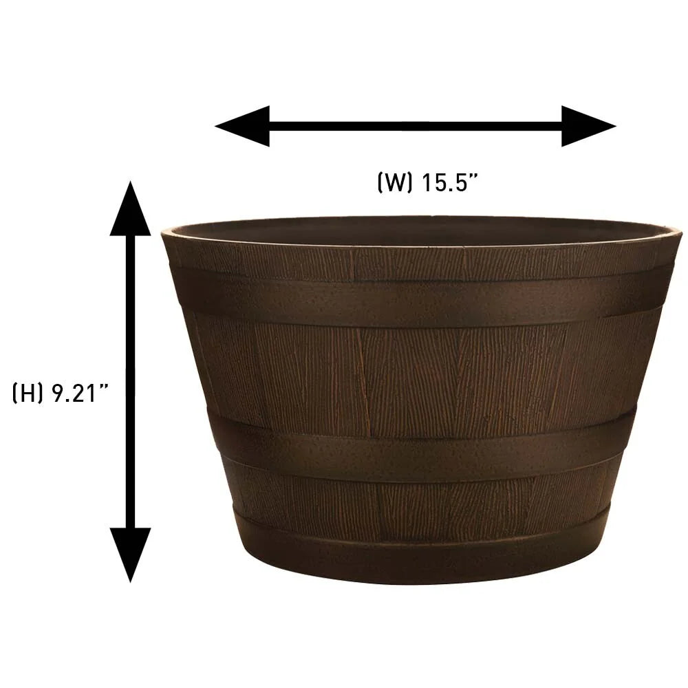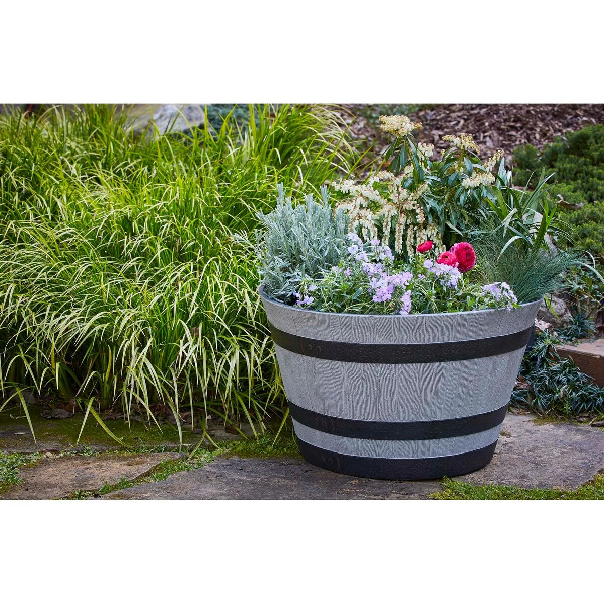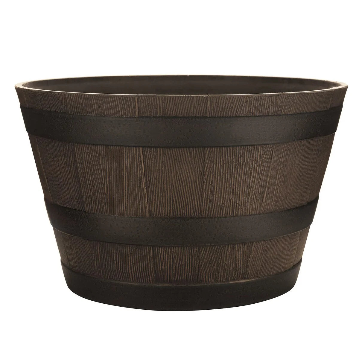 Create a cozy, country look with this whiskey barrel planter. Made from durable plastic, the fade and crack-resistant frame features a slatted design. Choose from two finishes and three sizes to fit your favorite flowers and plants.