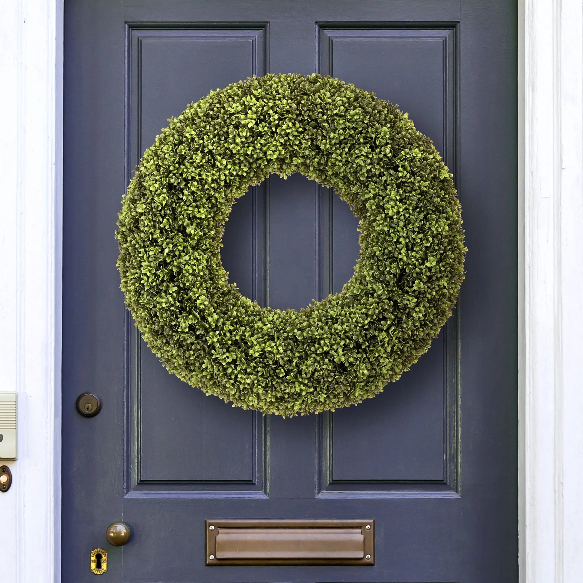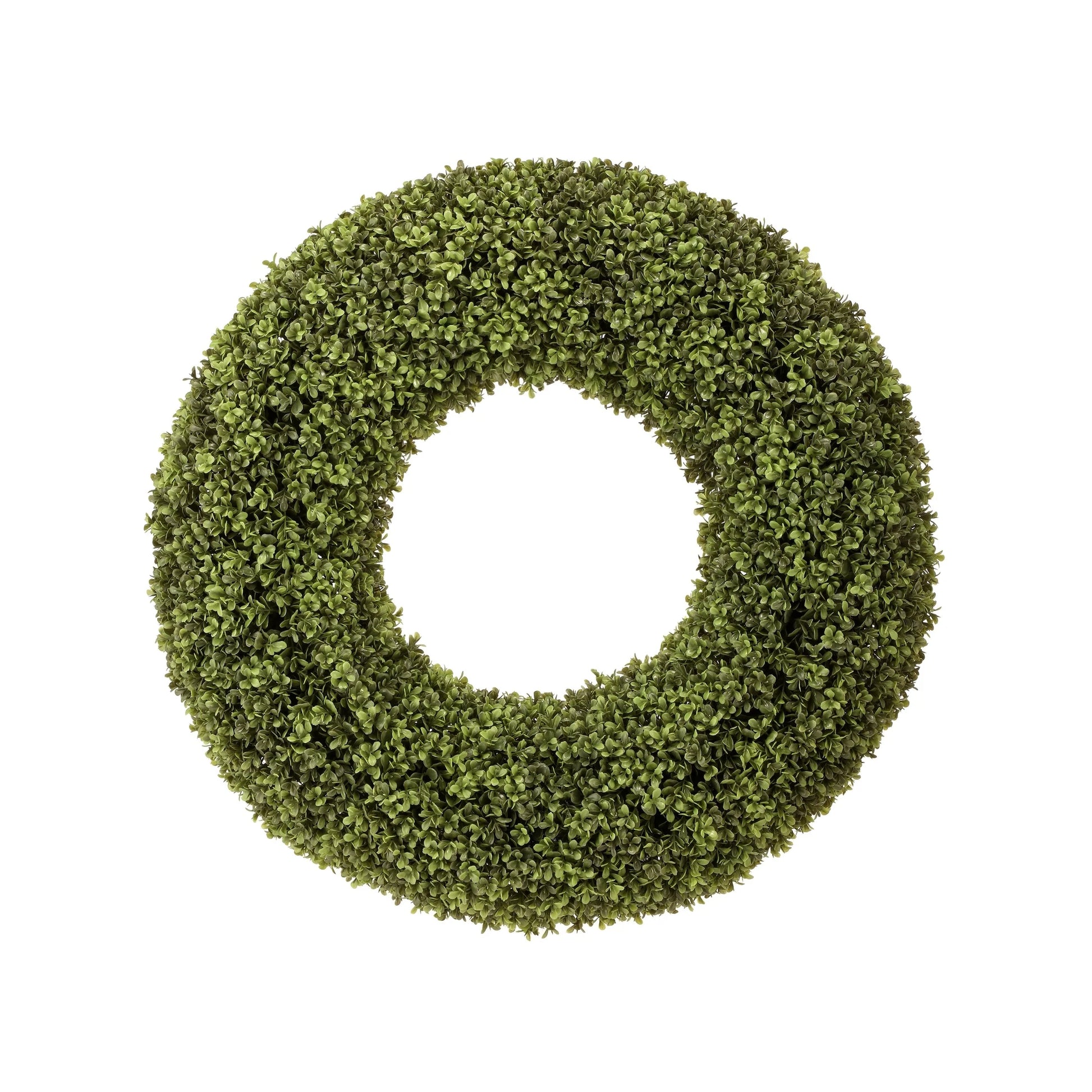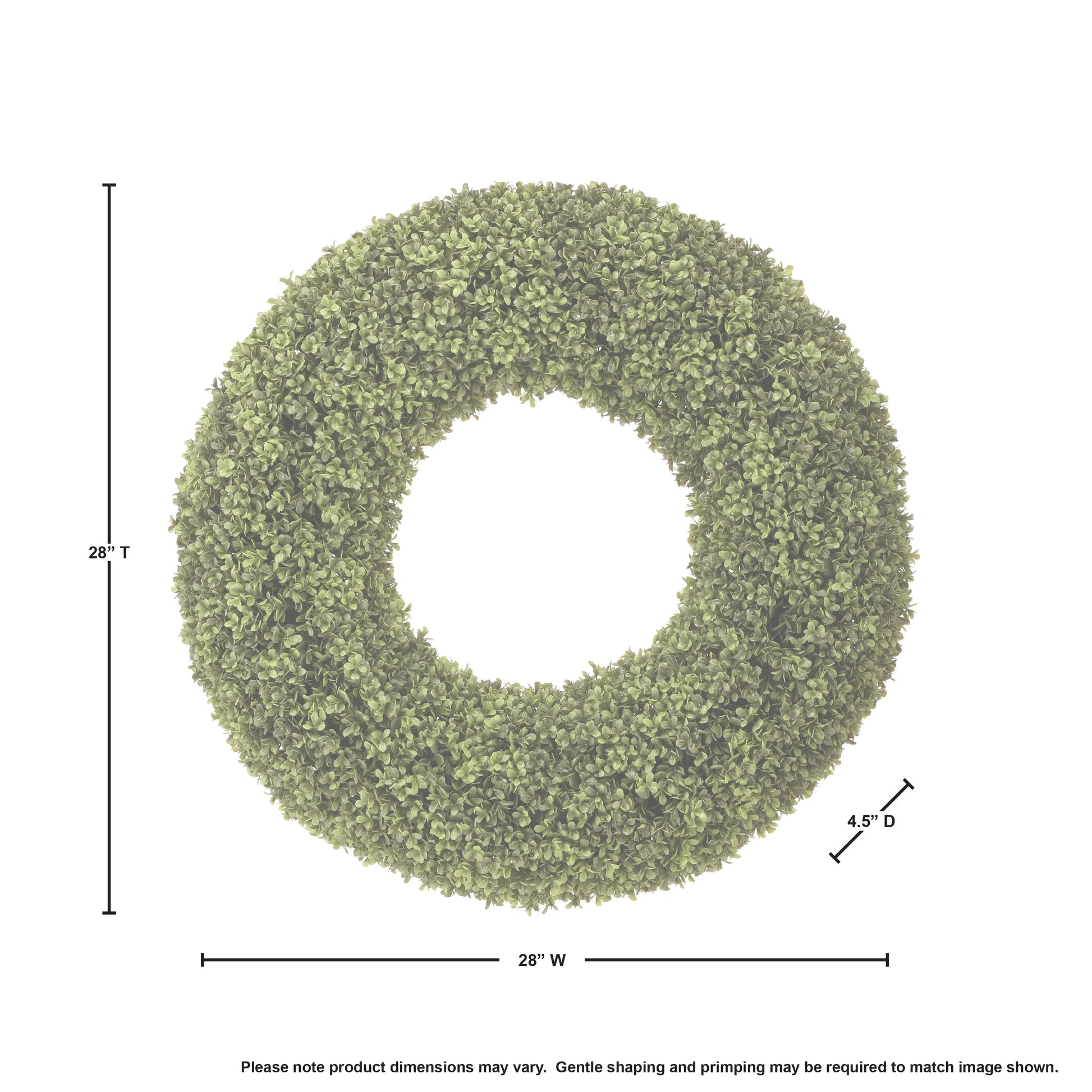 Immerse yourself in the beauty of nature without the maintenance of a real plant with an exquisite 28" Spring Boxwood Wreath . Crafted with precision, plastic, and attention to detail, this wreath boasts lush, lifelike foliage that remains vibrant and green, thanks to its UV-treated design. UV-treated leaves also make this an ideal choice for indoor and outdoor settings. Arrives ready to hang with a wired twig base, no additional mounting tools are required. Perfect for hanging on a front door, windows, entrance ways, in the kitchen, and over a fireplace. The product ships compressed and may require additional priming to match the image shown. Blow with canned air for cleaning. Measures 28" H x 28" Wx 5"L 5lbs.