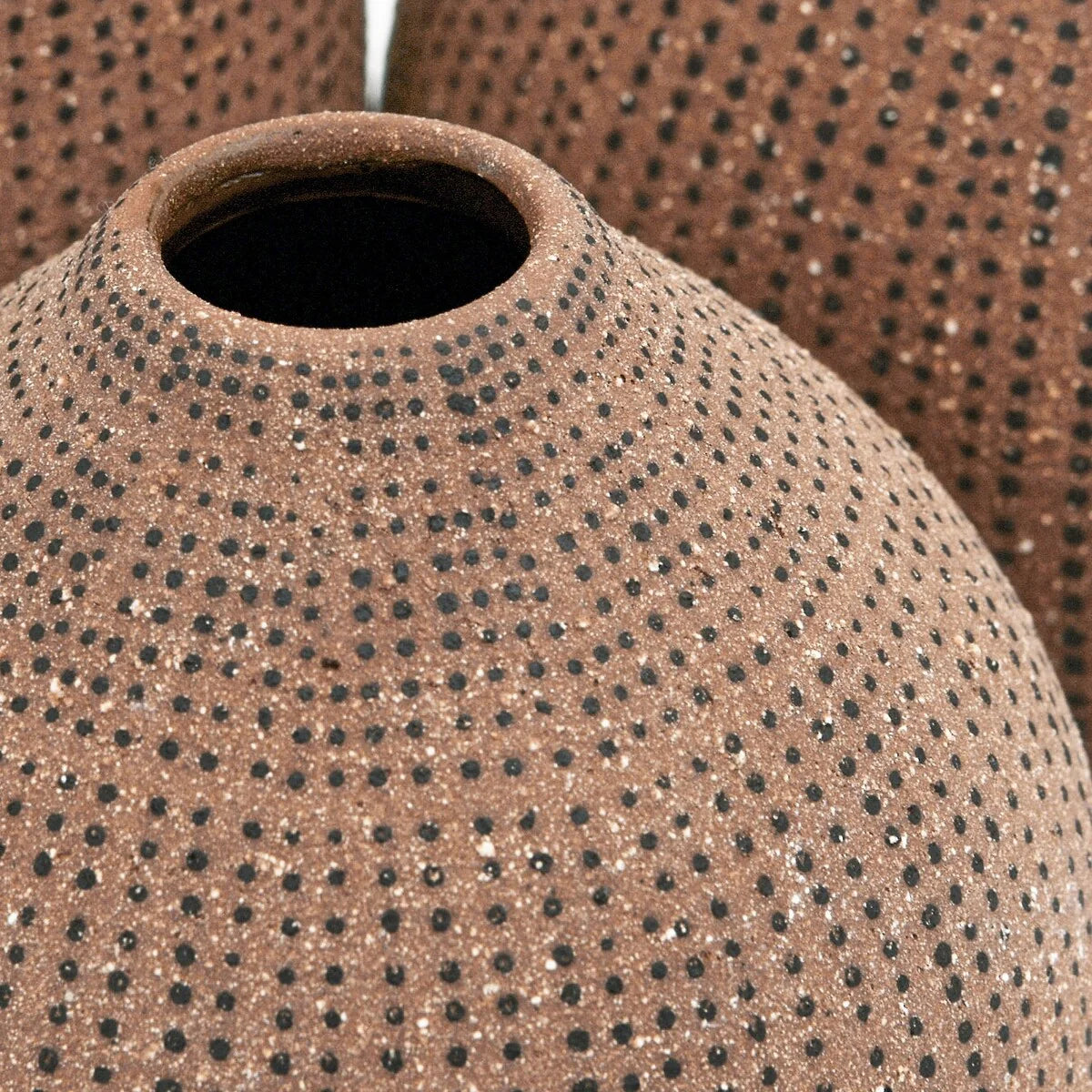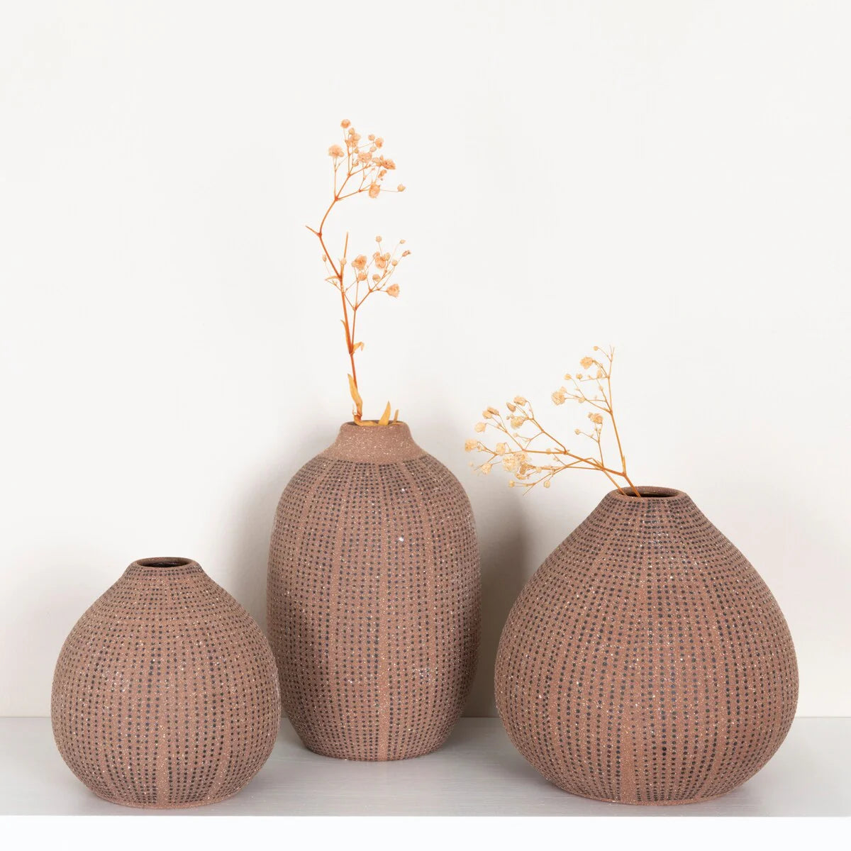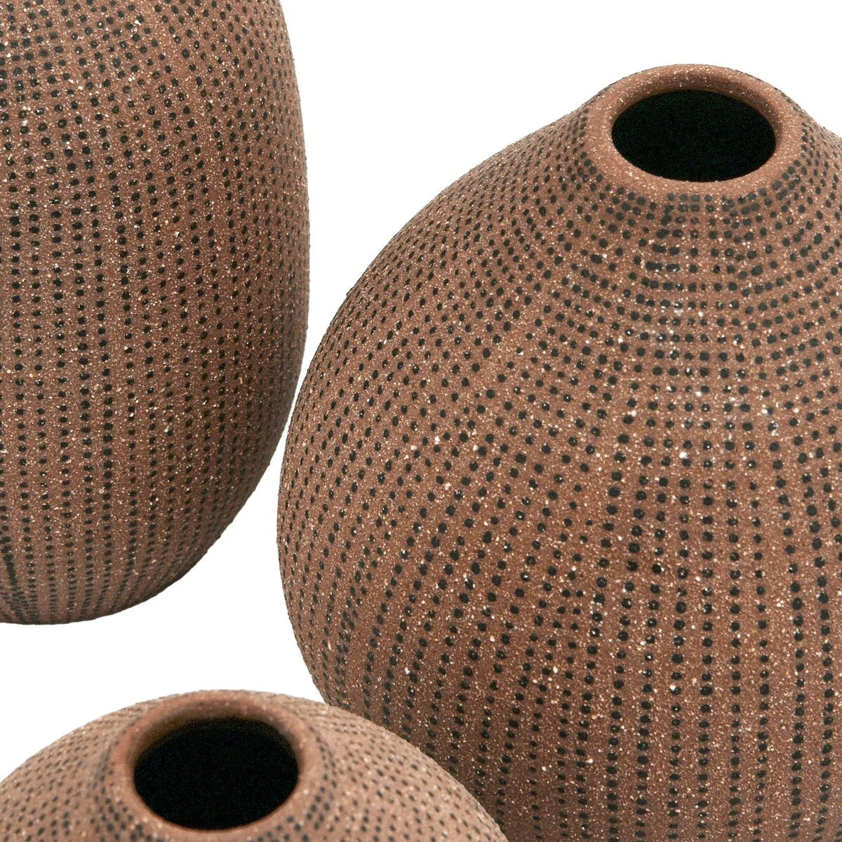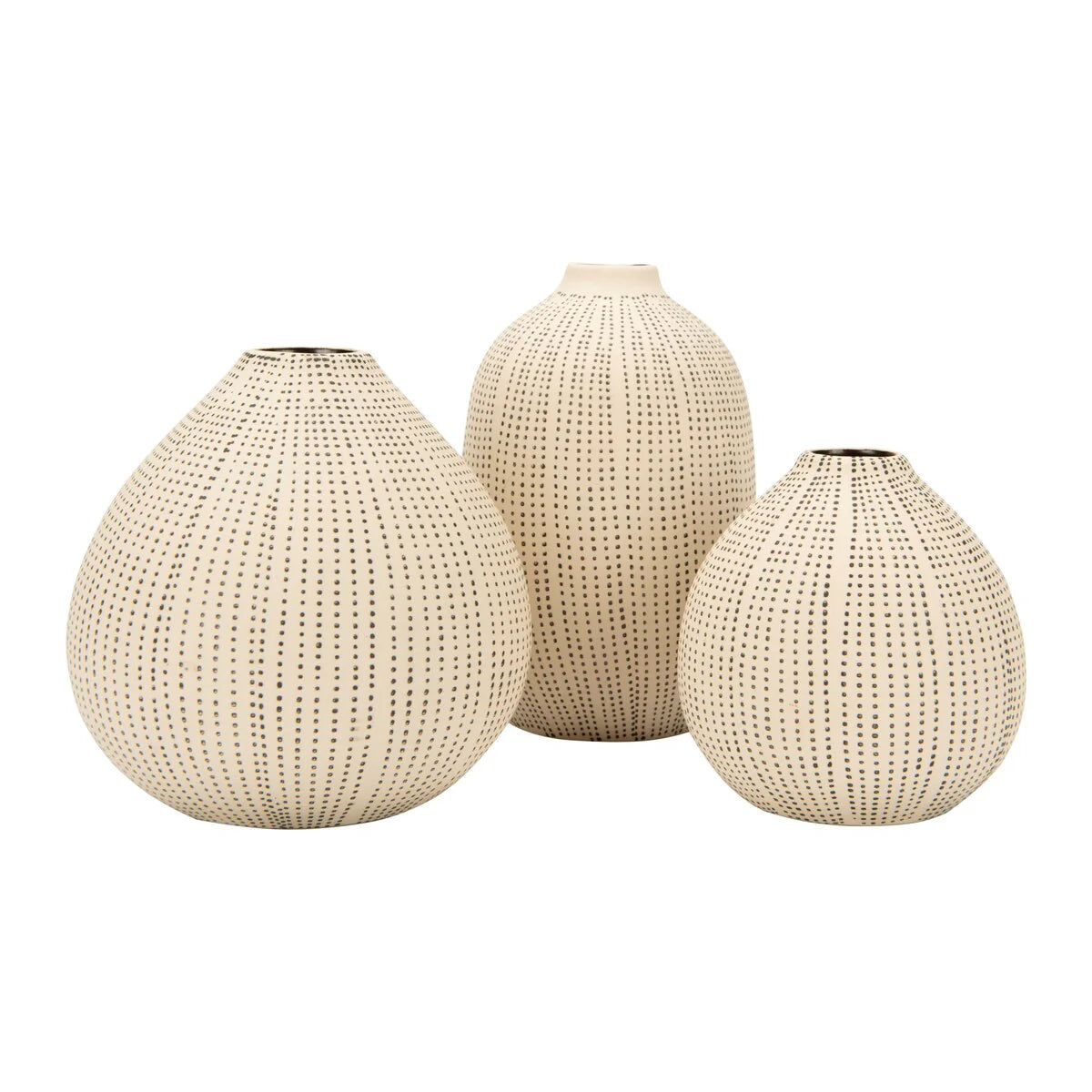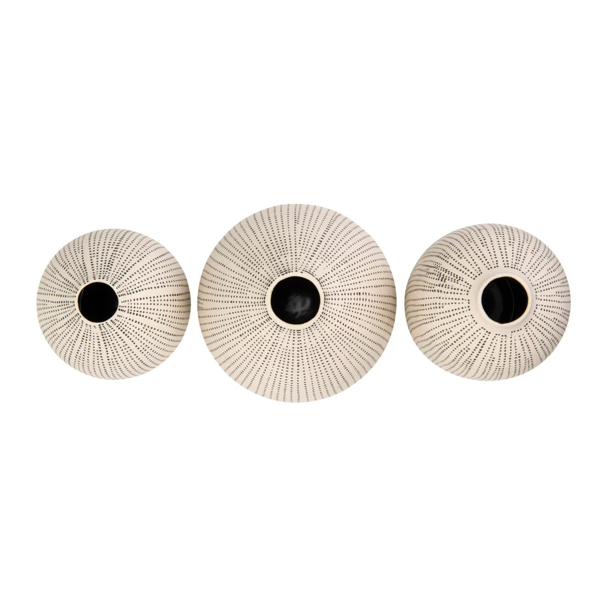 A lovely and playful way to display flowers or enhance any space, these stoneware vases with polka dot finish have a round shape and a slightly tapered rim that adds some elegance and charm. The vases are crafted from premium stoneware that has a smooth and glossy finish. They can be used as decorative accents on their own or in a group. The small vase measures 3.5 inches round, and 3.5 inches in height. The medium vase measures 4.75 inches round, and 4.75 inches in height. The large vase measures 3.5 inches round, and 5.5 inches in height. The opening diameter of the vases are 0.86 inch, 0.95 inch, and 1 inch respectively. They can be placed on tables, shelves, mantels, or floors. They can also be used as a gift for friends or family who love flowers and design. Whether used indoors or outdoors, these white and black stoneware vases with polka dot finish add some personality and beauty to any space.