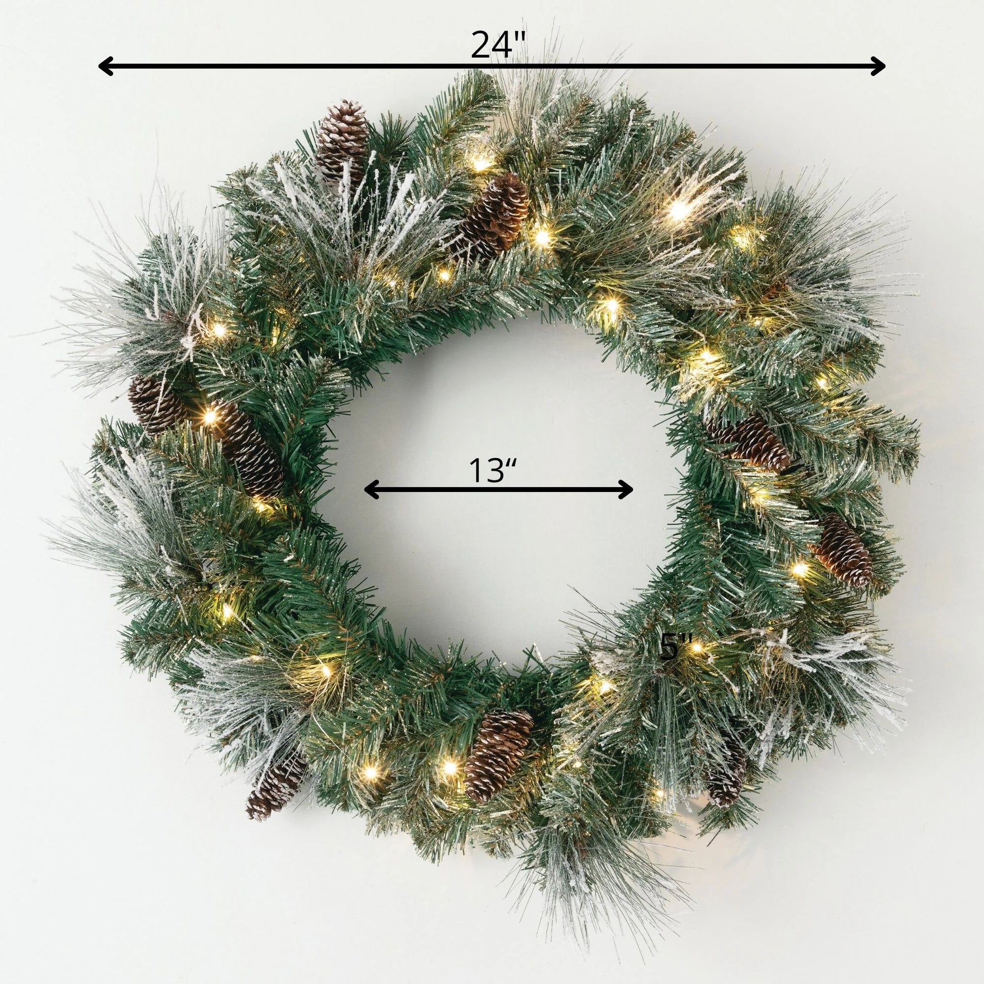 Sullivans Artificial 24" Flocked LED Pine Christmas Wreath with Pinecones, Green, Indoor Christmas Decor