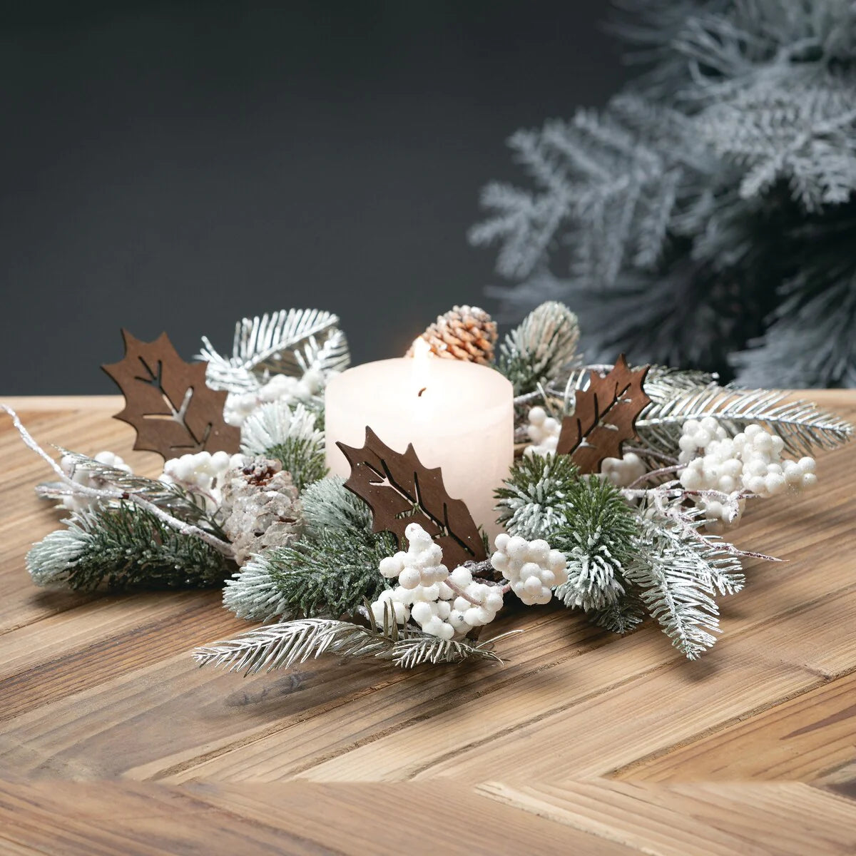- Enhance the glow of your holiday candles with our exquisite Berry And Leaf Christmas Wreath and Christmas Candle Ring, designed to add a touch of elegance and charm to any candle display.