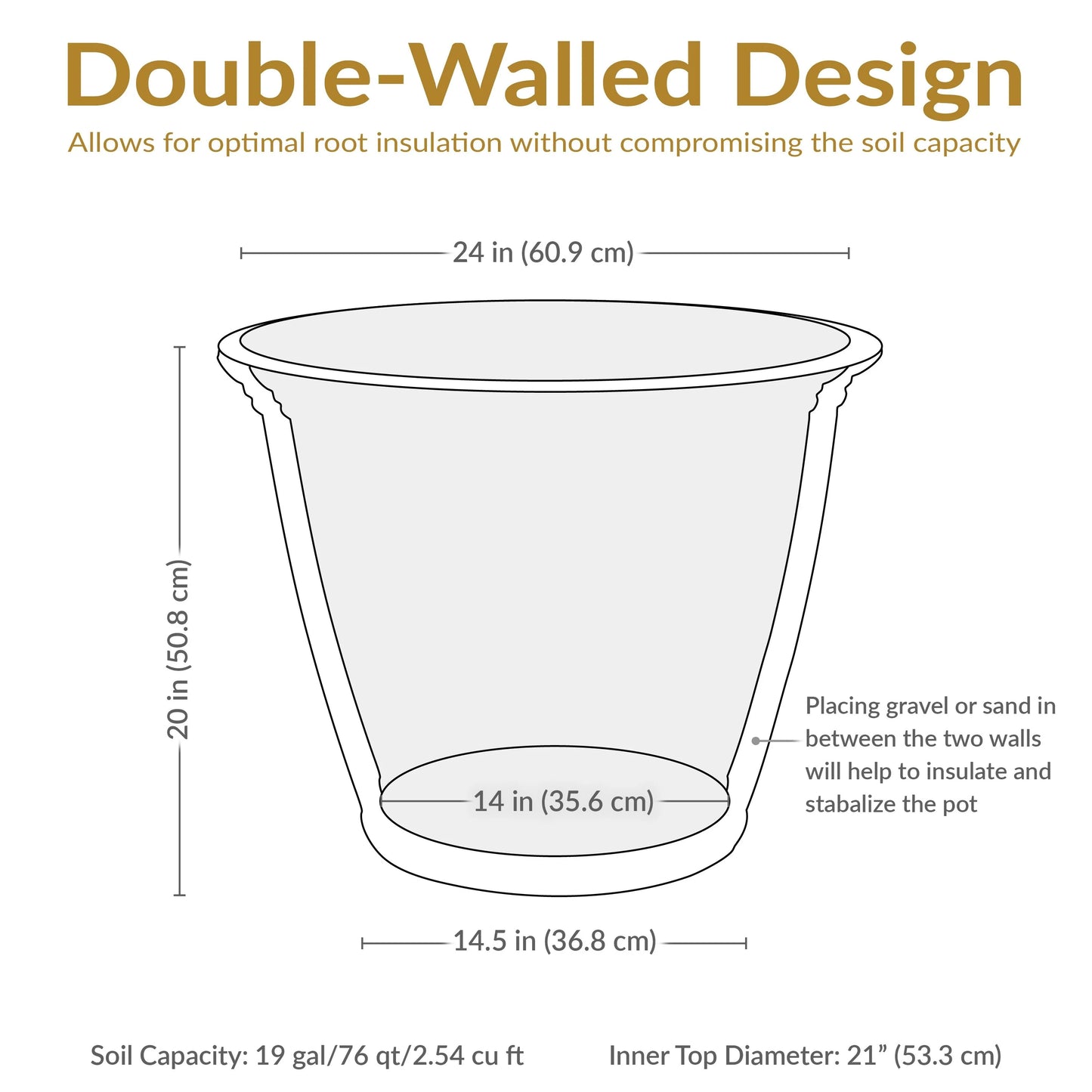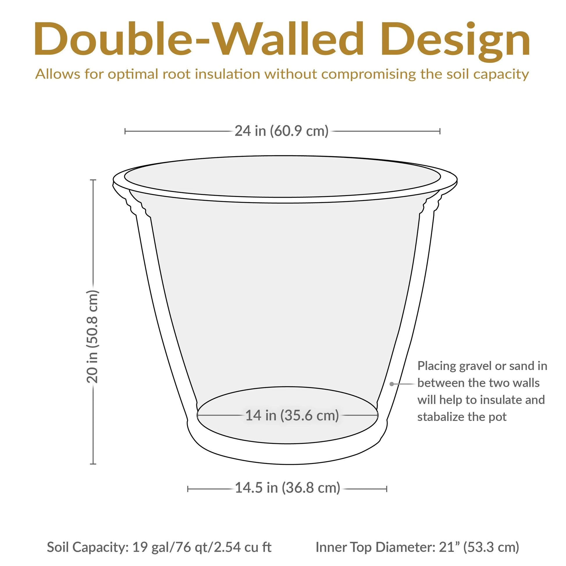 - Double-wall design with full-depth inner wall for optimal root insulation