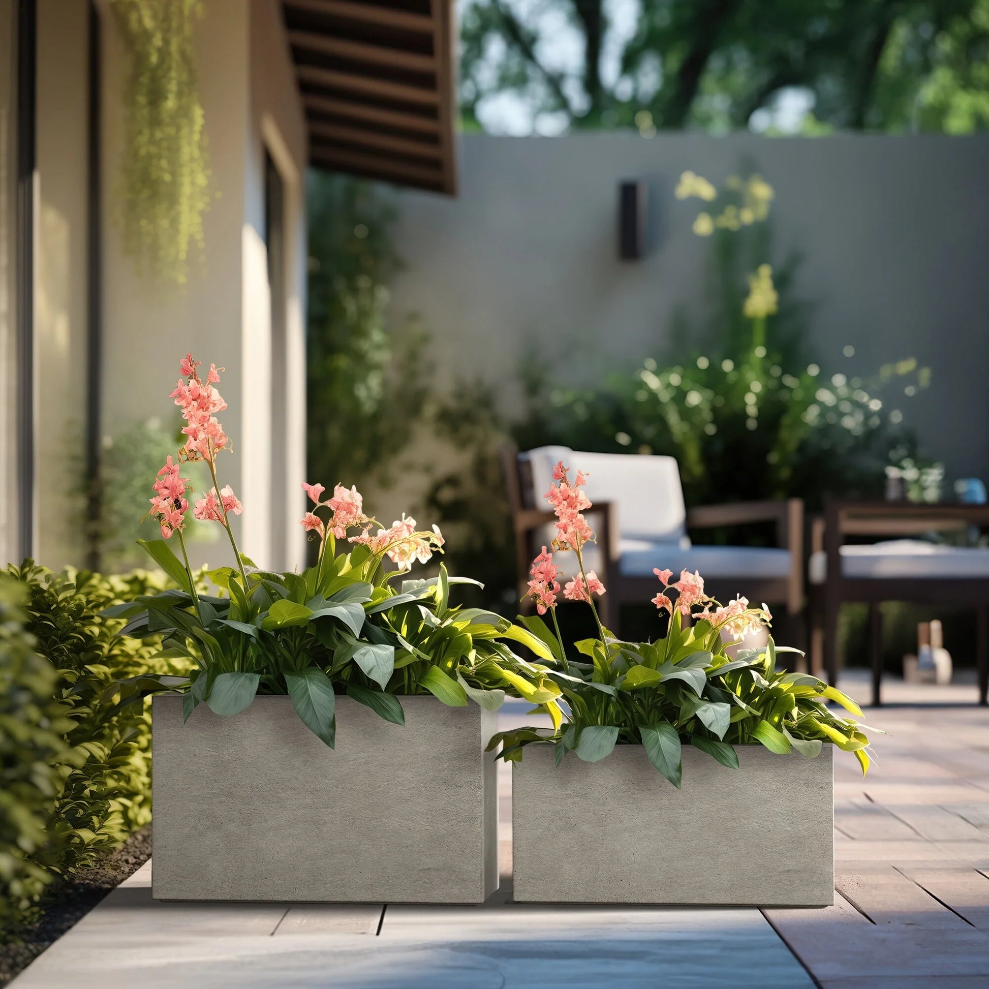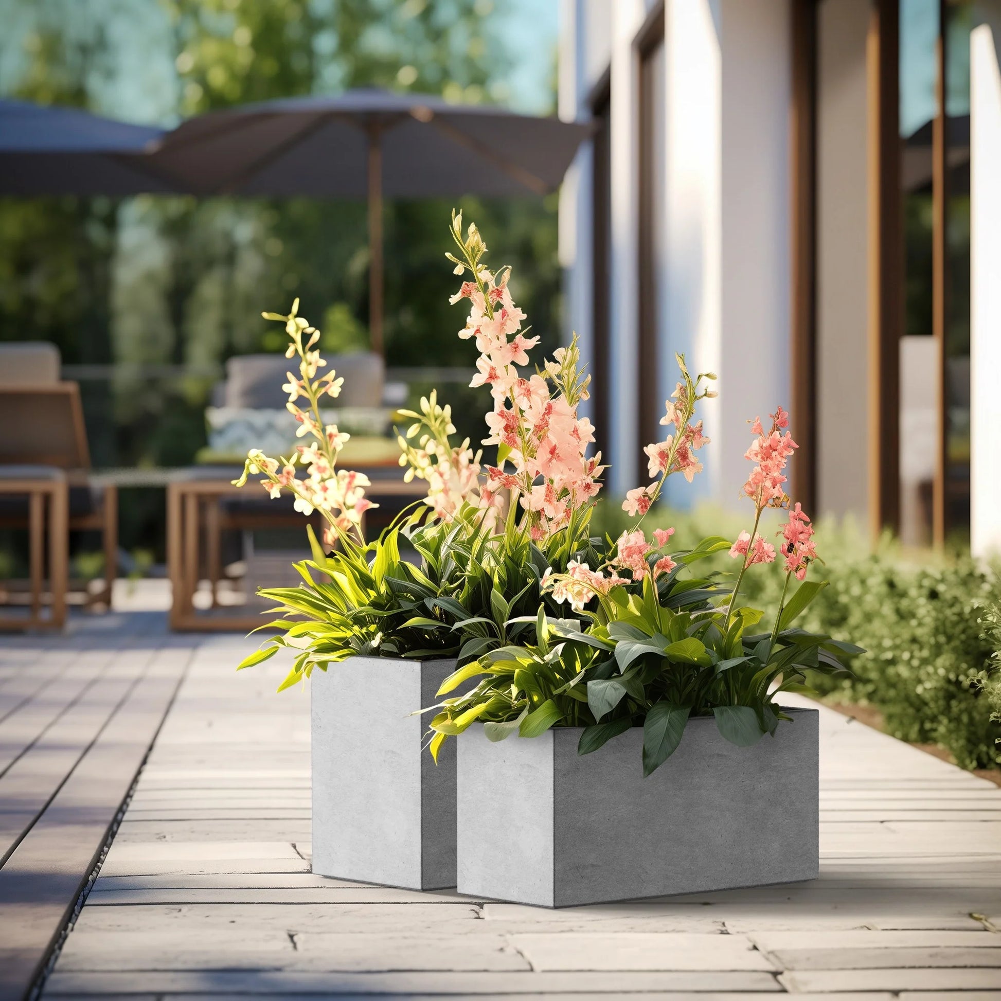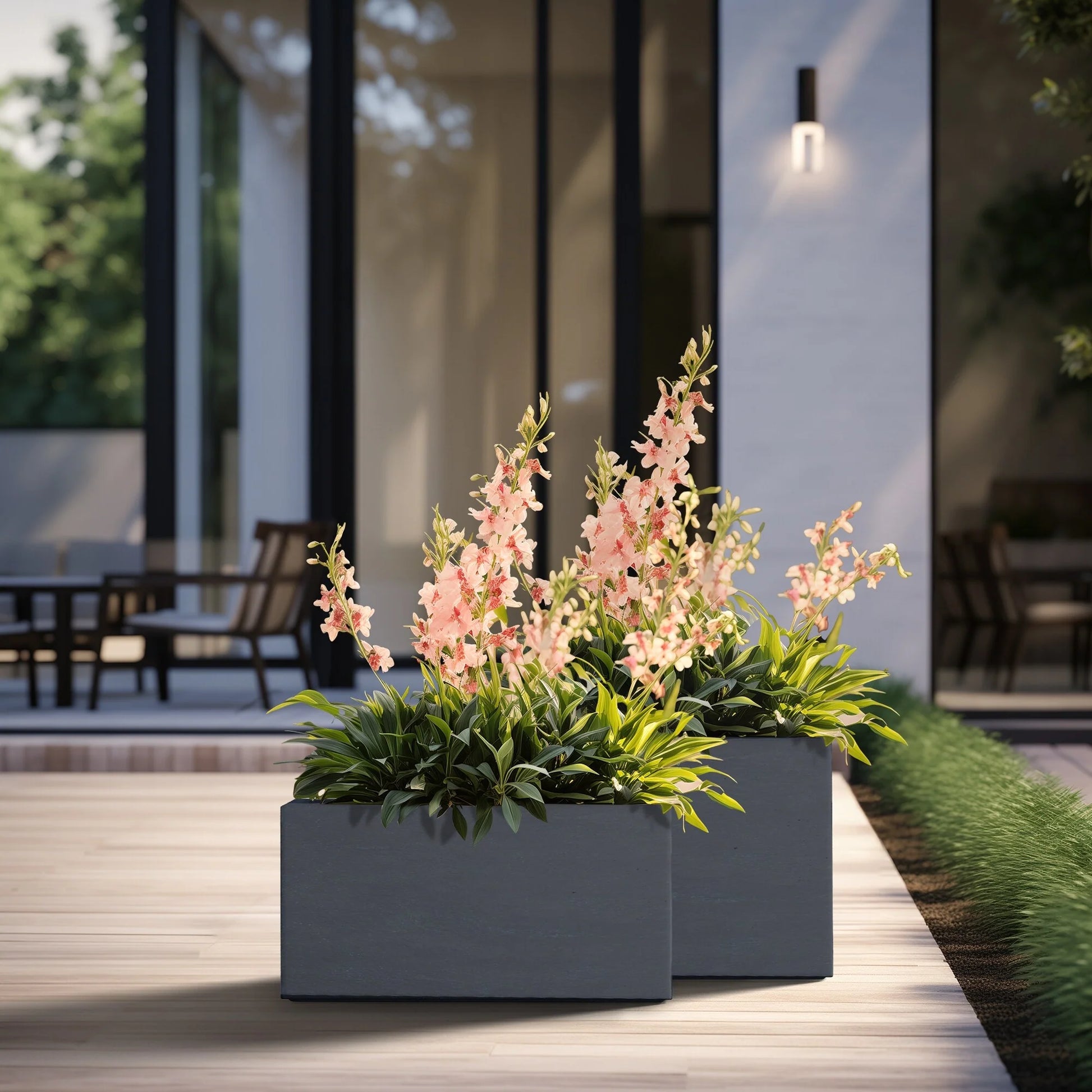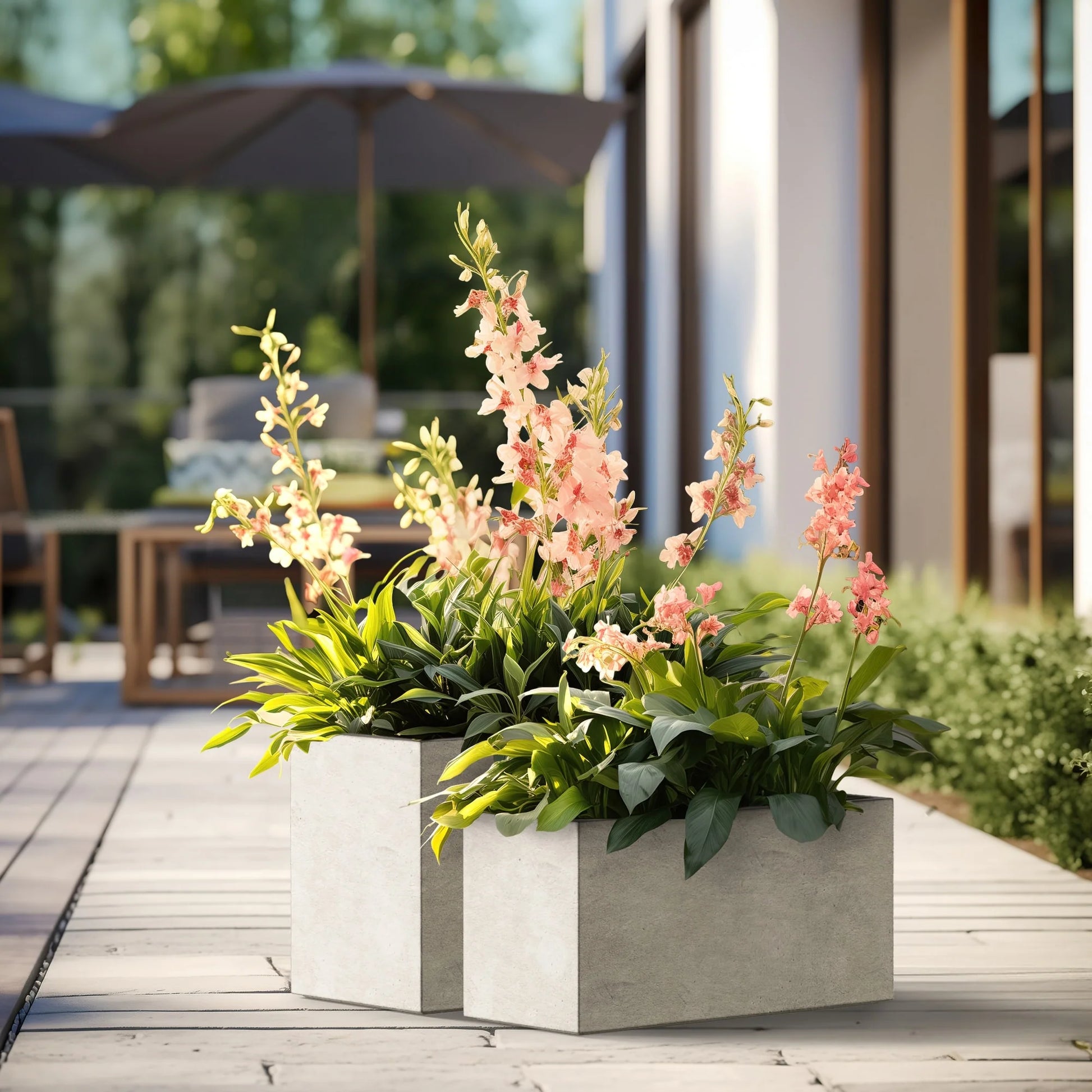 Reimagine your green space with the Durx-litecrete square cement planters, where robust functionality meets sleek, angular design. These contemporary planters feature a sophisticated concrete finish with fine pores that reveal their high-quality craftsmanship. Despite their solid square build, these planters remain surprisingly lightweight, a perfect choice for enhancing both indoor and outdoor environments. The smooth finish contrasts beautifully with the natural roughness of concrete. With ample room to support a range of plants, they make a statement on any city balcony or in a sprawling garden, adding a touch of elegance with their adaptable concrete finish.