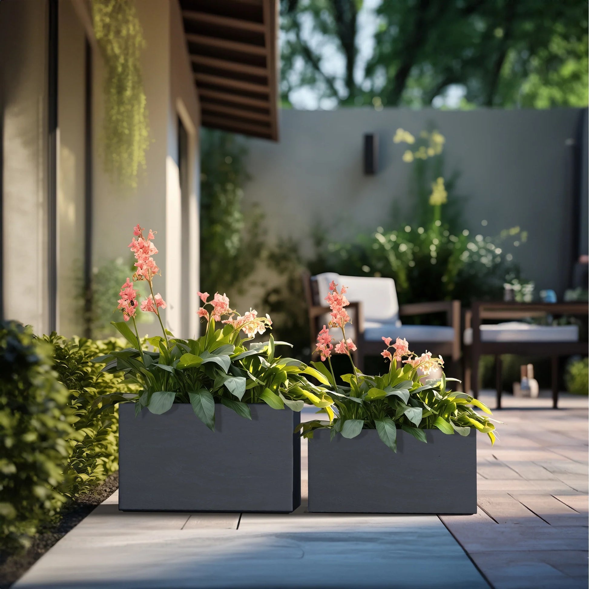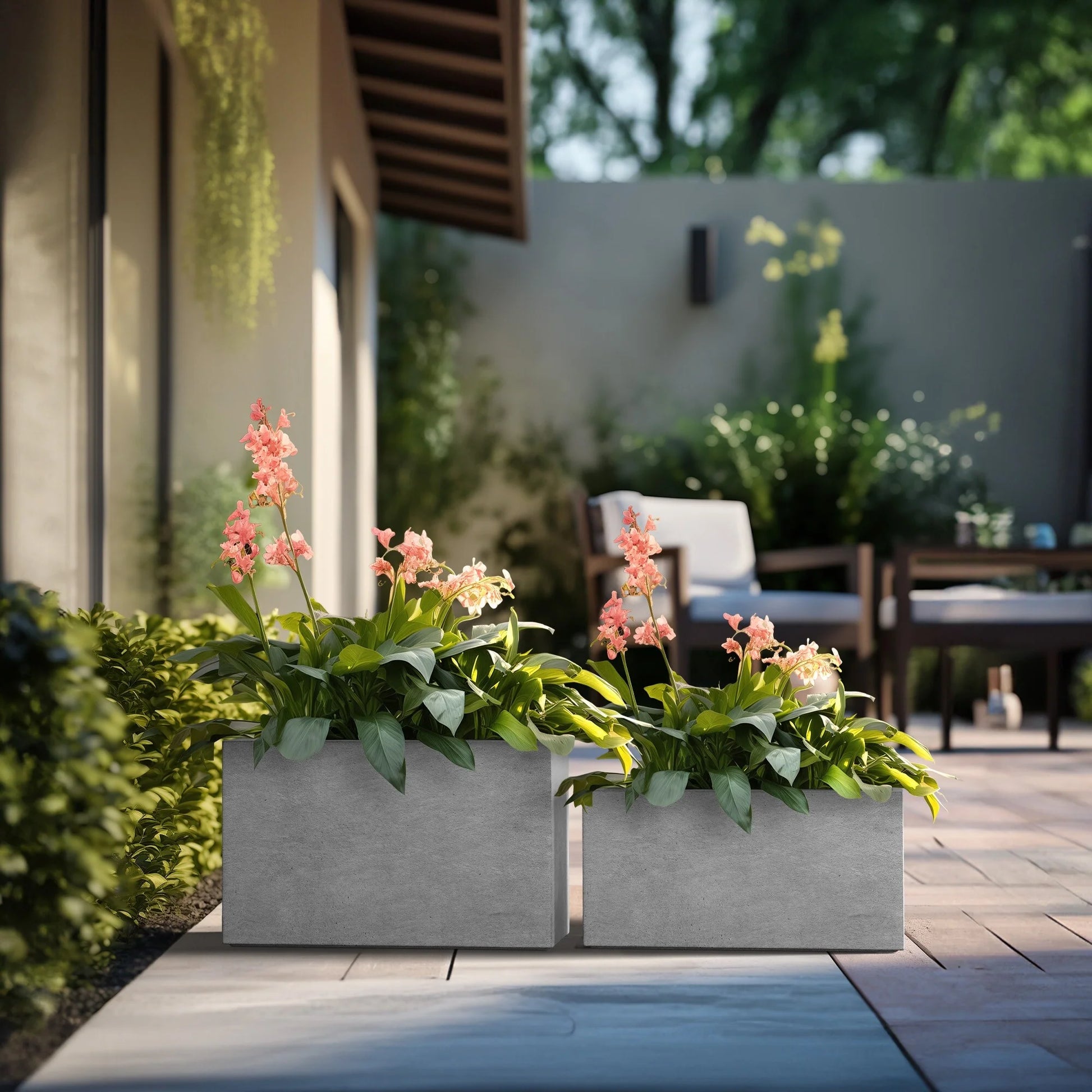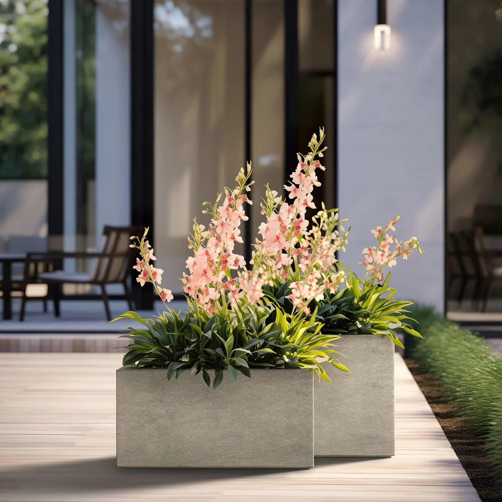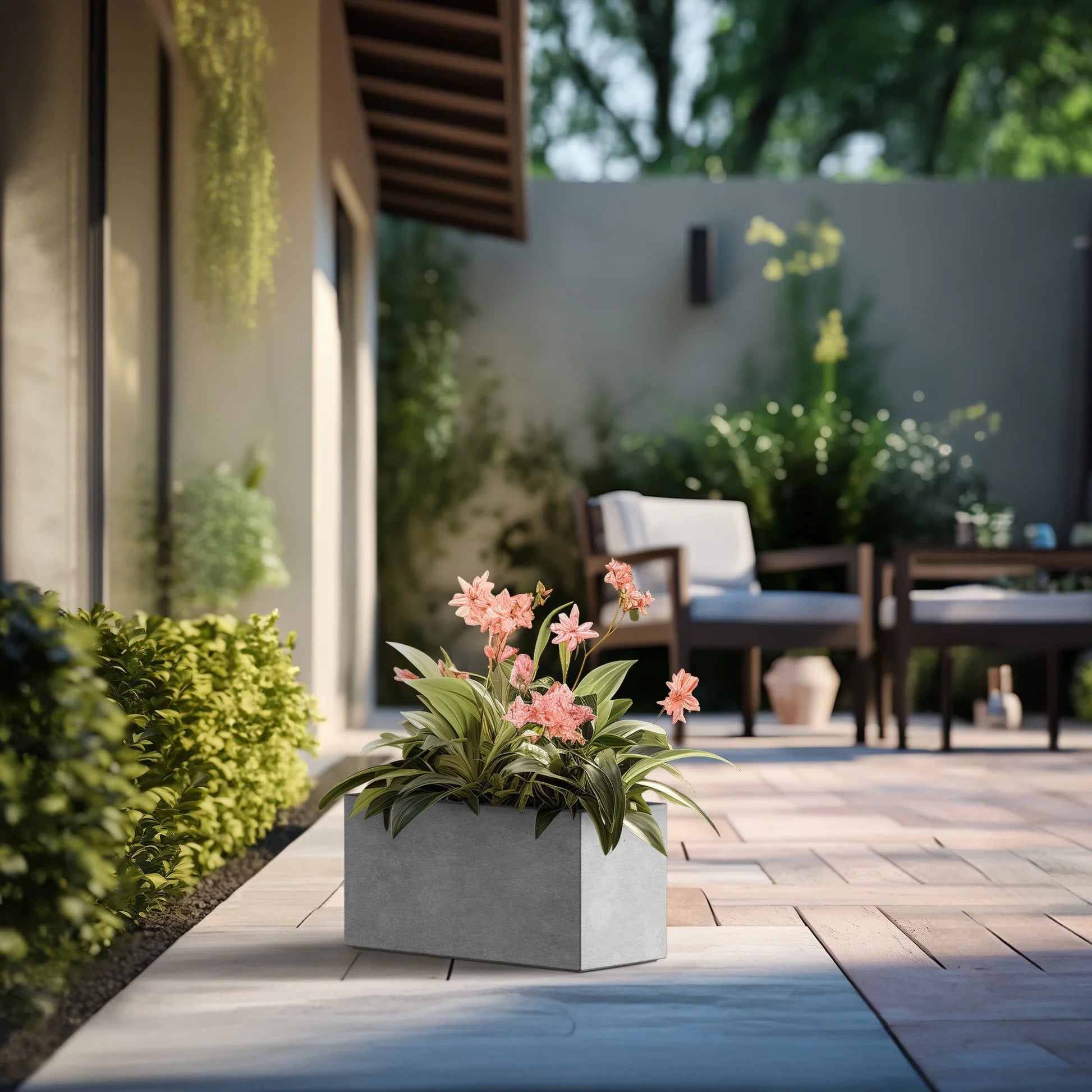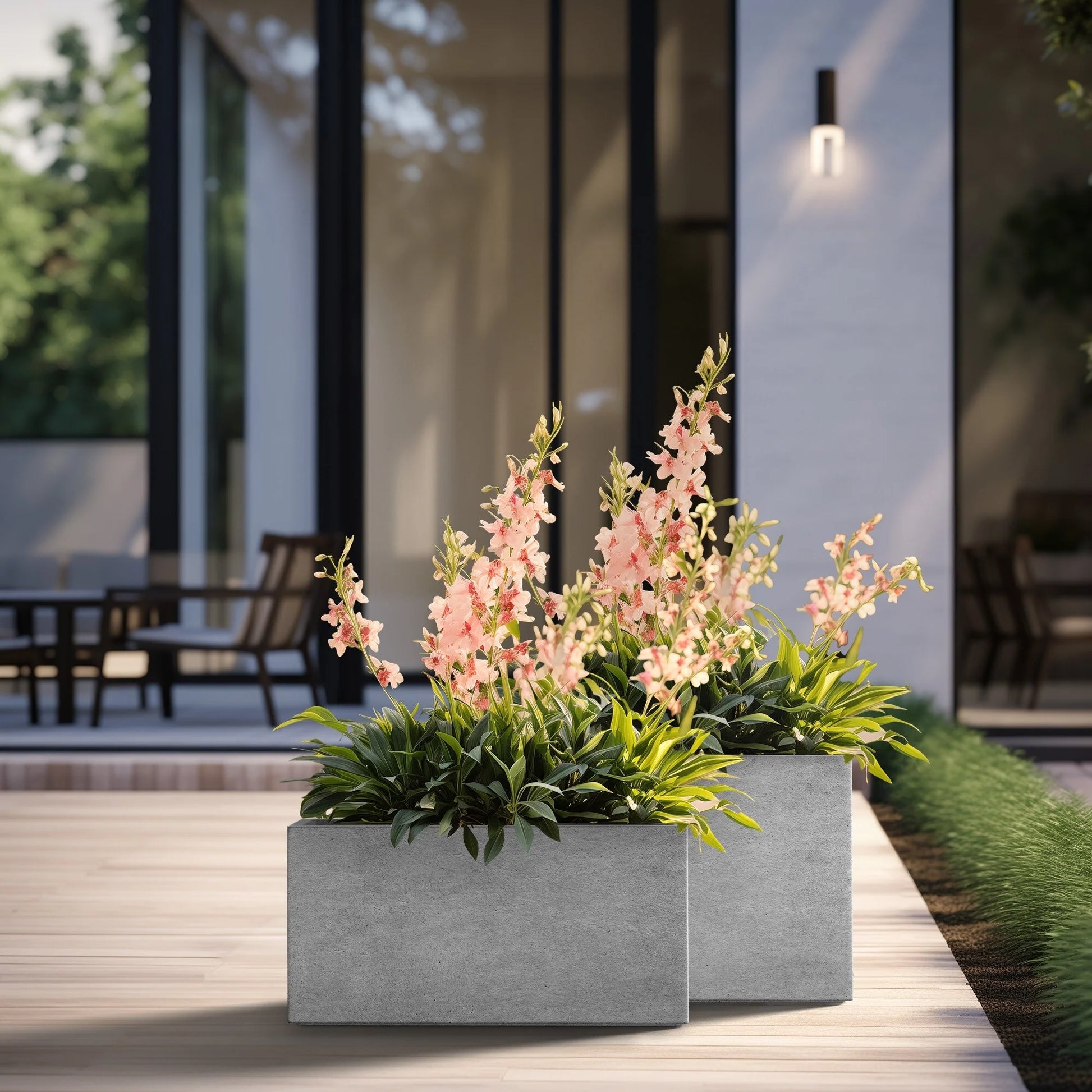 Reimagine your green space with the Durx-litecrete square cement planters, where robust functionality meets sleek, angular design. These contemporary planters feature a sophisticated concrete finish with fine pores that reveal their high-quality craftsmanship. Despite their solid square build, these planters remain surprisingly lightweight, a perfect choice for enhancing both indoor and outdoor environments. The smooth finish contrasts beautifully with the natural roughness of concrete. With ample room to support a range of plants, they make a statement on any city balcony or in a sprawling garden, adding a touch of elegance with their adaptable concrete finish.