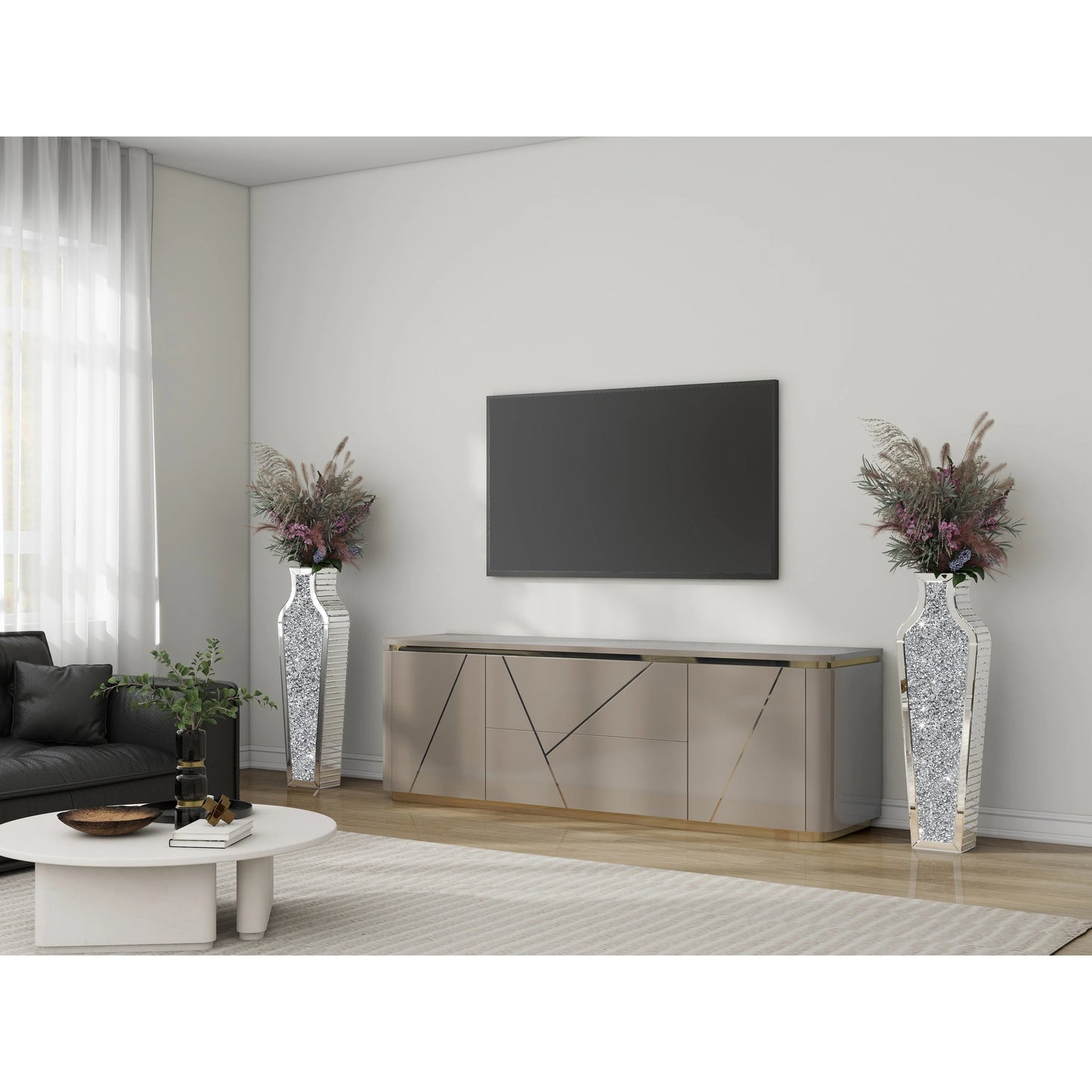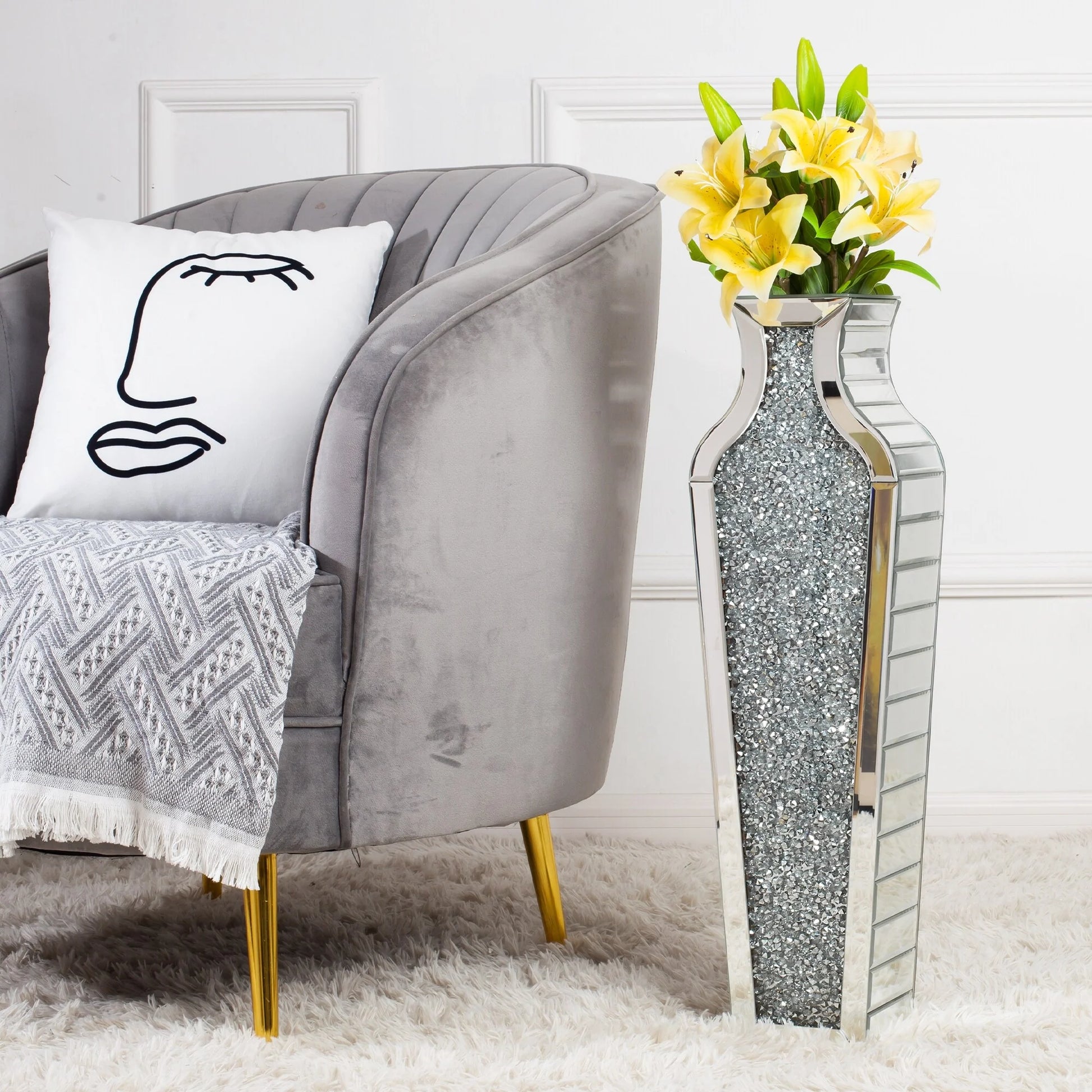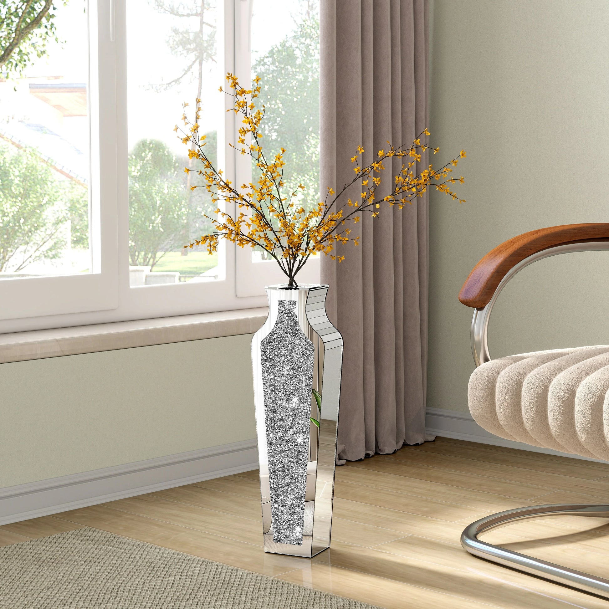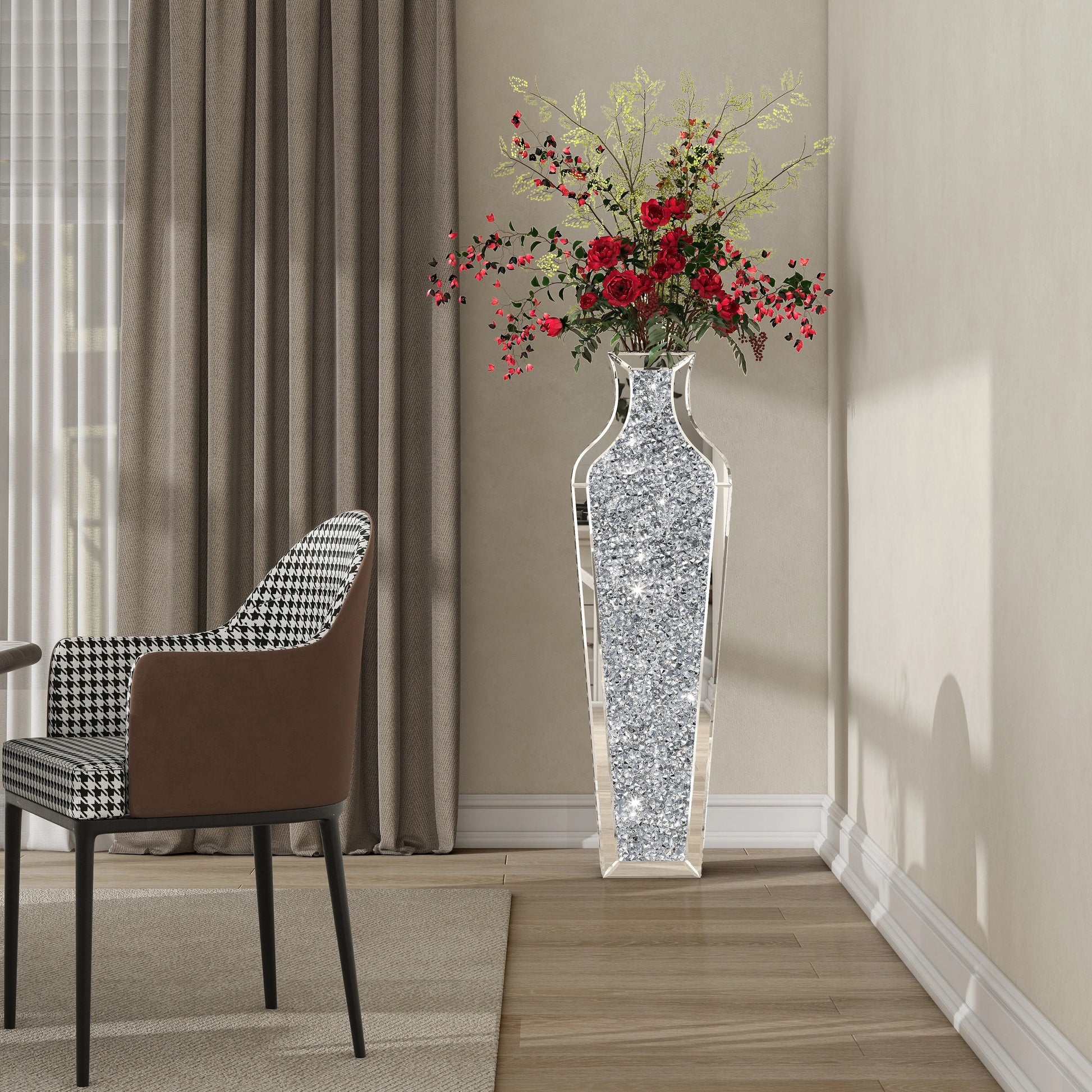 If you like to decorate your home, this floor vase will be your best choice, it can be well placed in any corner, especially at the entrance, next to the TV cabinet, in the middle of the sofa. Appreciate their design best against solid-colored backgrounds in elegant settings. They make great unique decor on mantle, console table or in any living space. Designed with mirror top and crushed diamond vase body. This floor vase decorative botanical and flowers to bring some bright and texture in your living space. Suitable for indoor use. Glam style. Vase has a 4.6 in mouth opening,26.8"/36"/43" silver mirror vase.