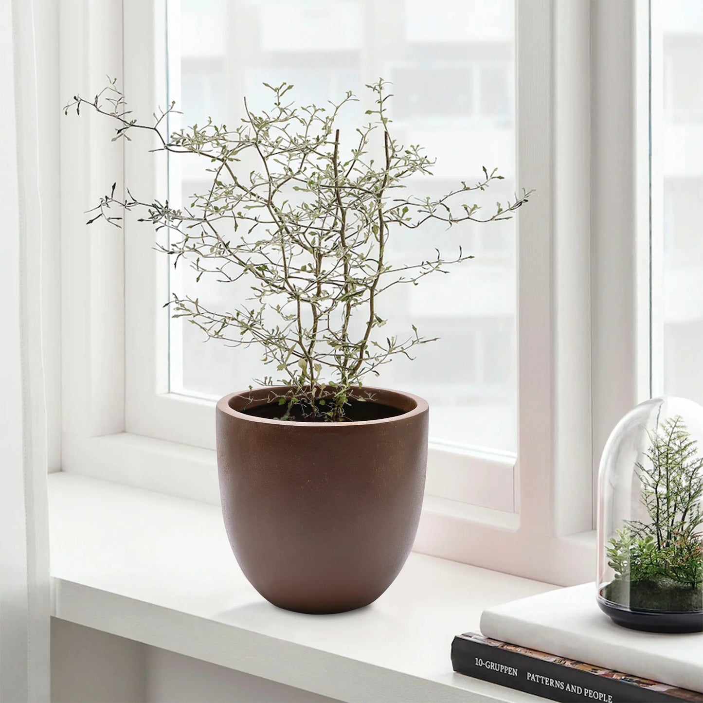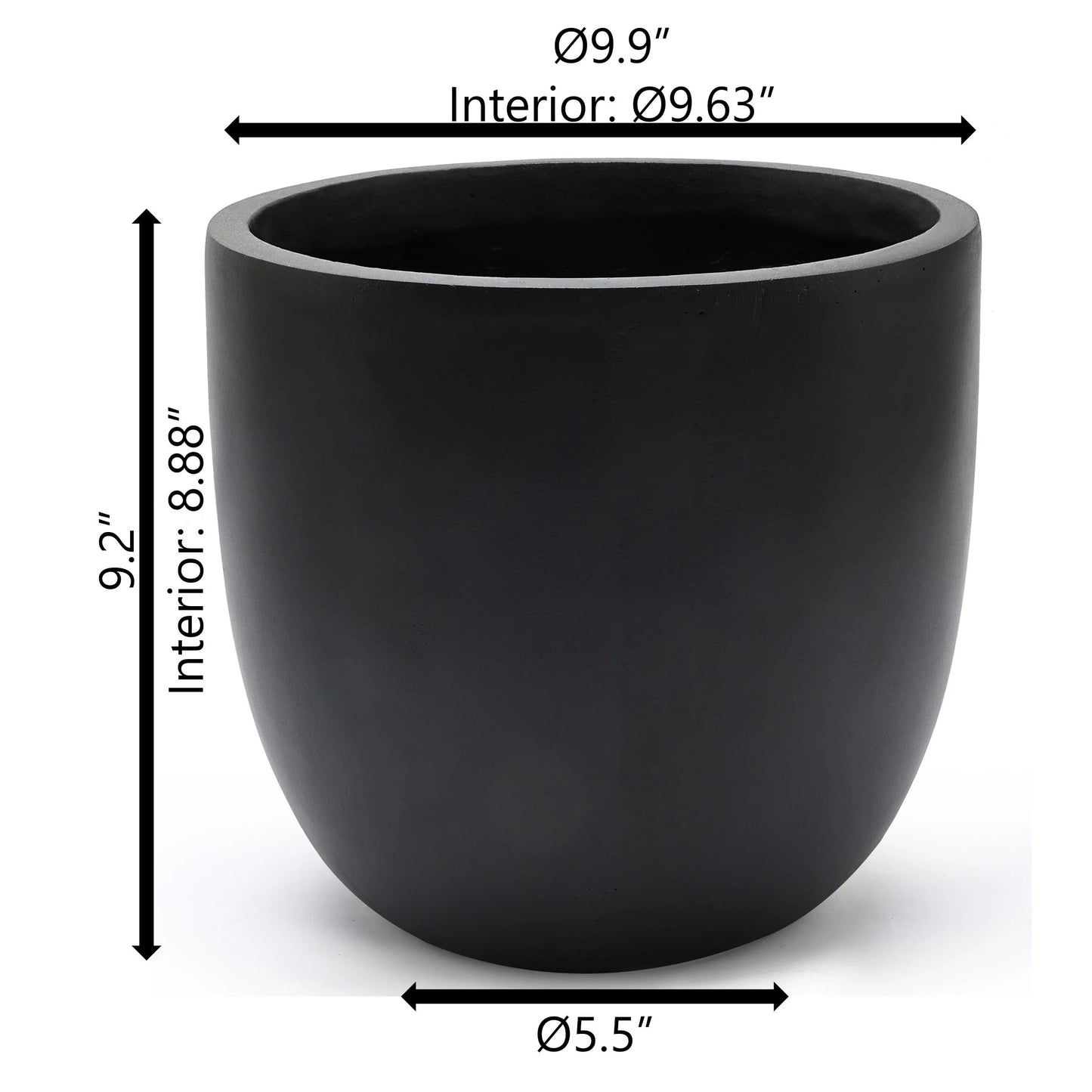 - Small planter size: 9.2"H x 9.9"D; base size: 5.5"D; interior size: 8.88"H x 9.63"D; weight: 9.2 lbs; capacity: 132 oz; drainage hole: 0.8-1"D