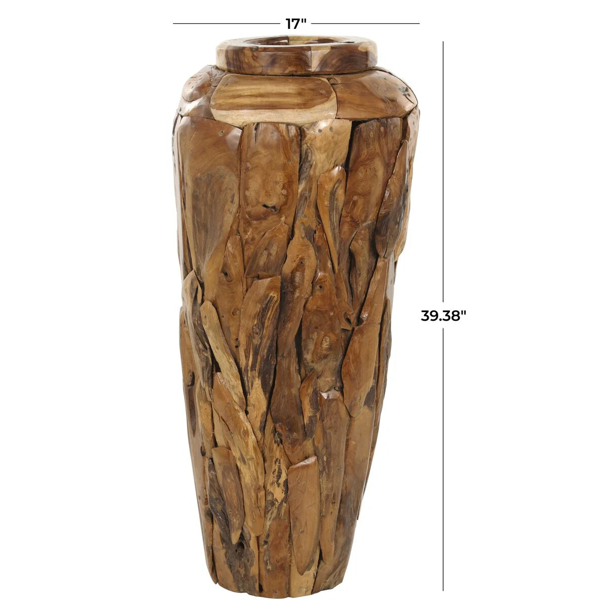 - The brown teak wood vase measures 15L x 15W x 31.50H inches or 17L x 17W x 39.38H, and weighs 34 lbs or 52.50 lbs