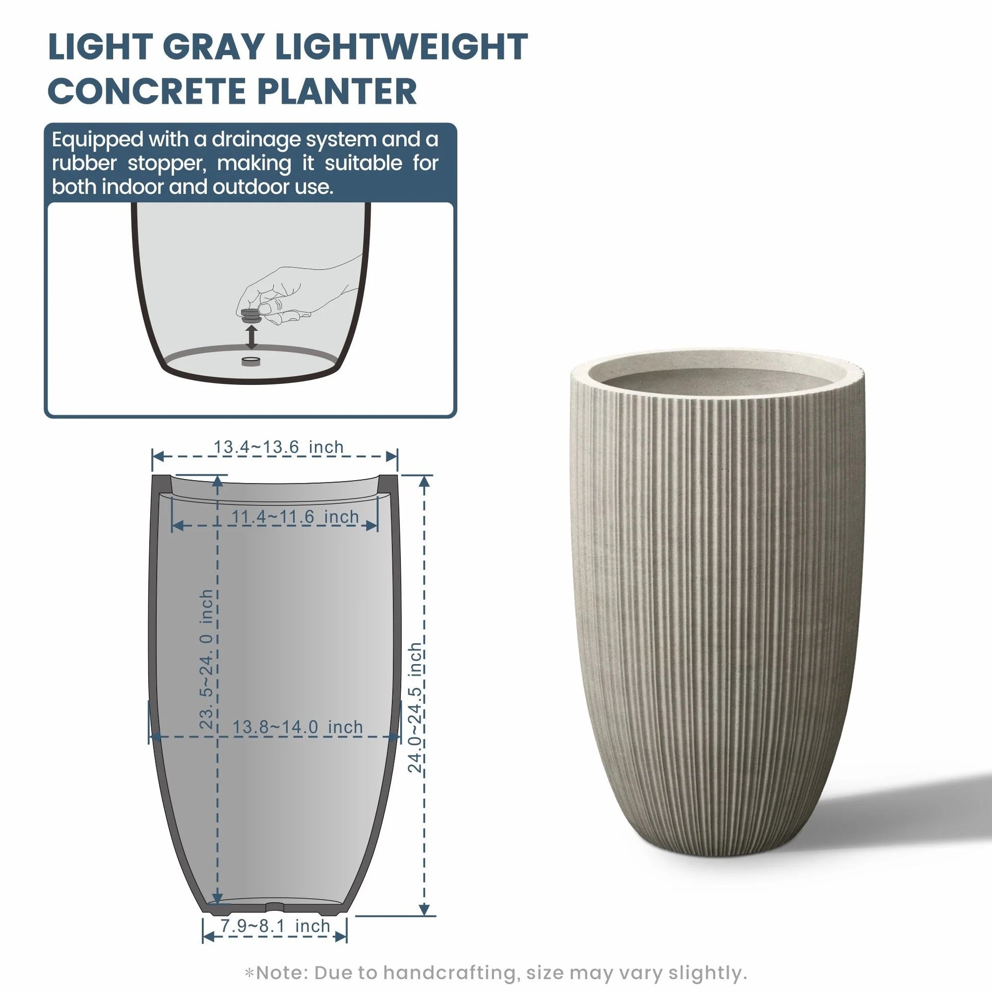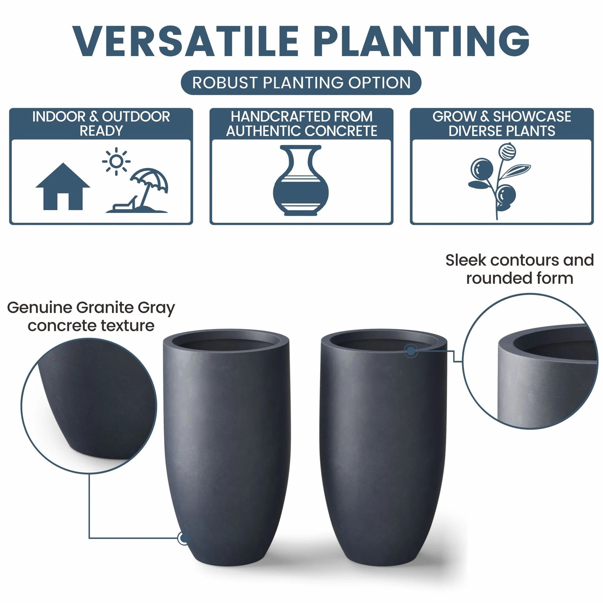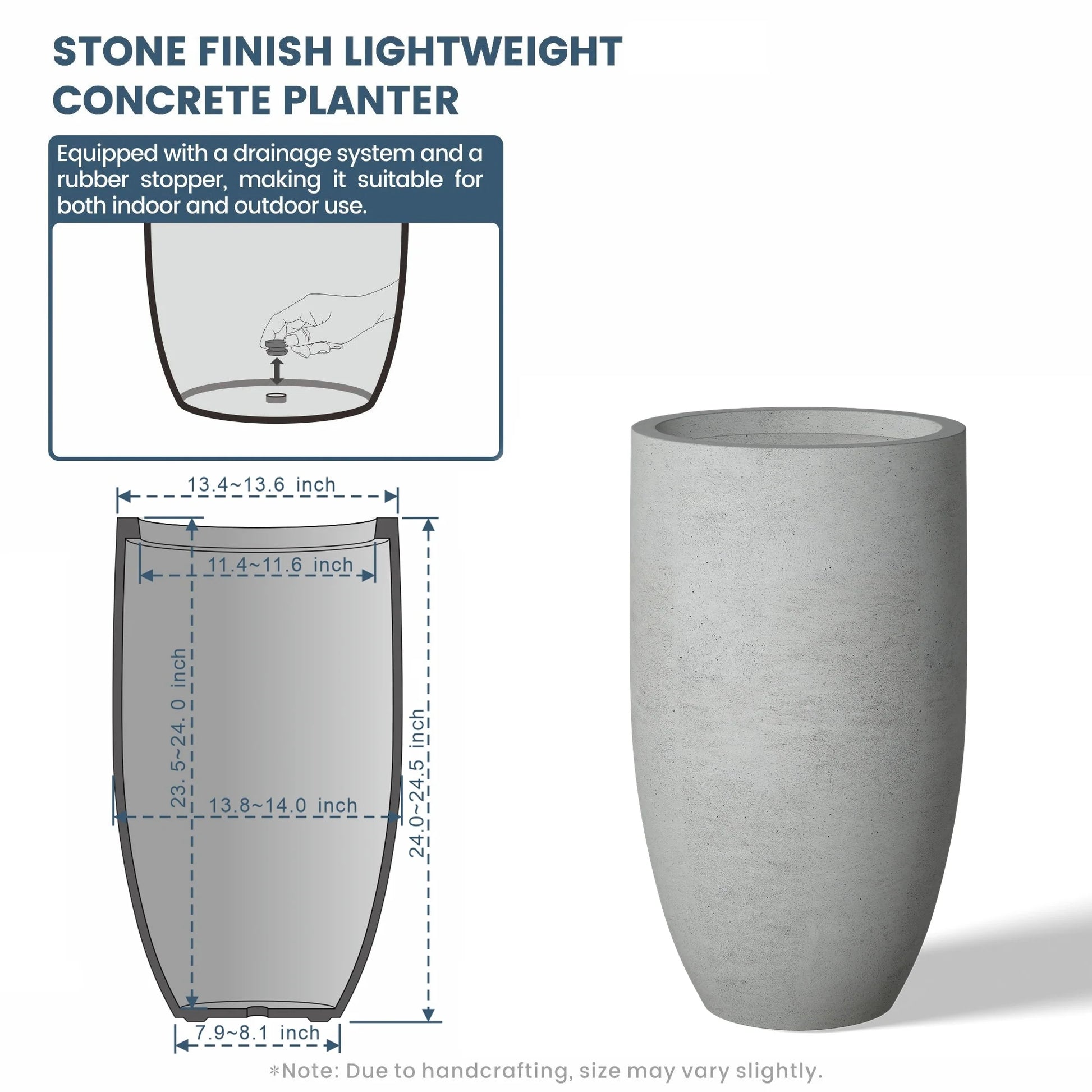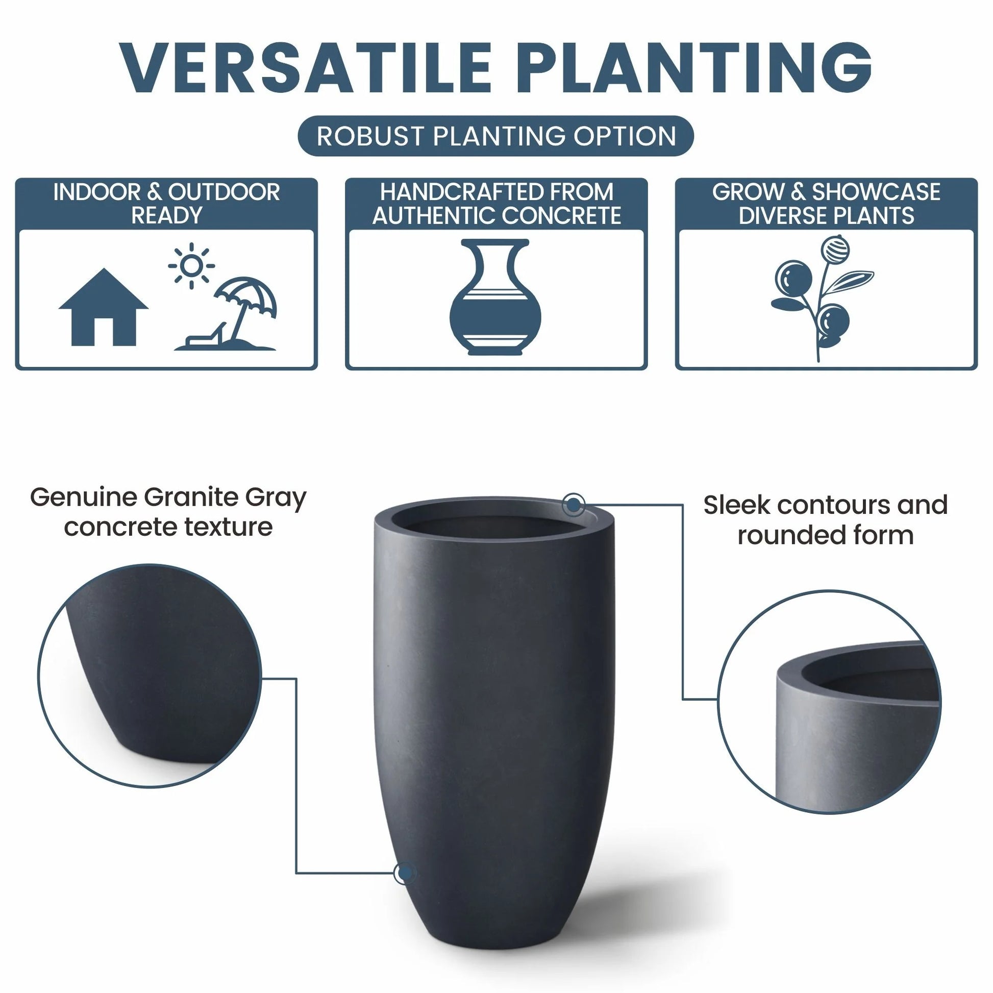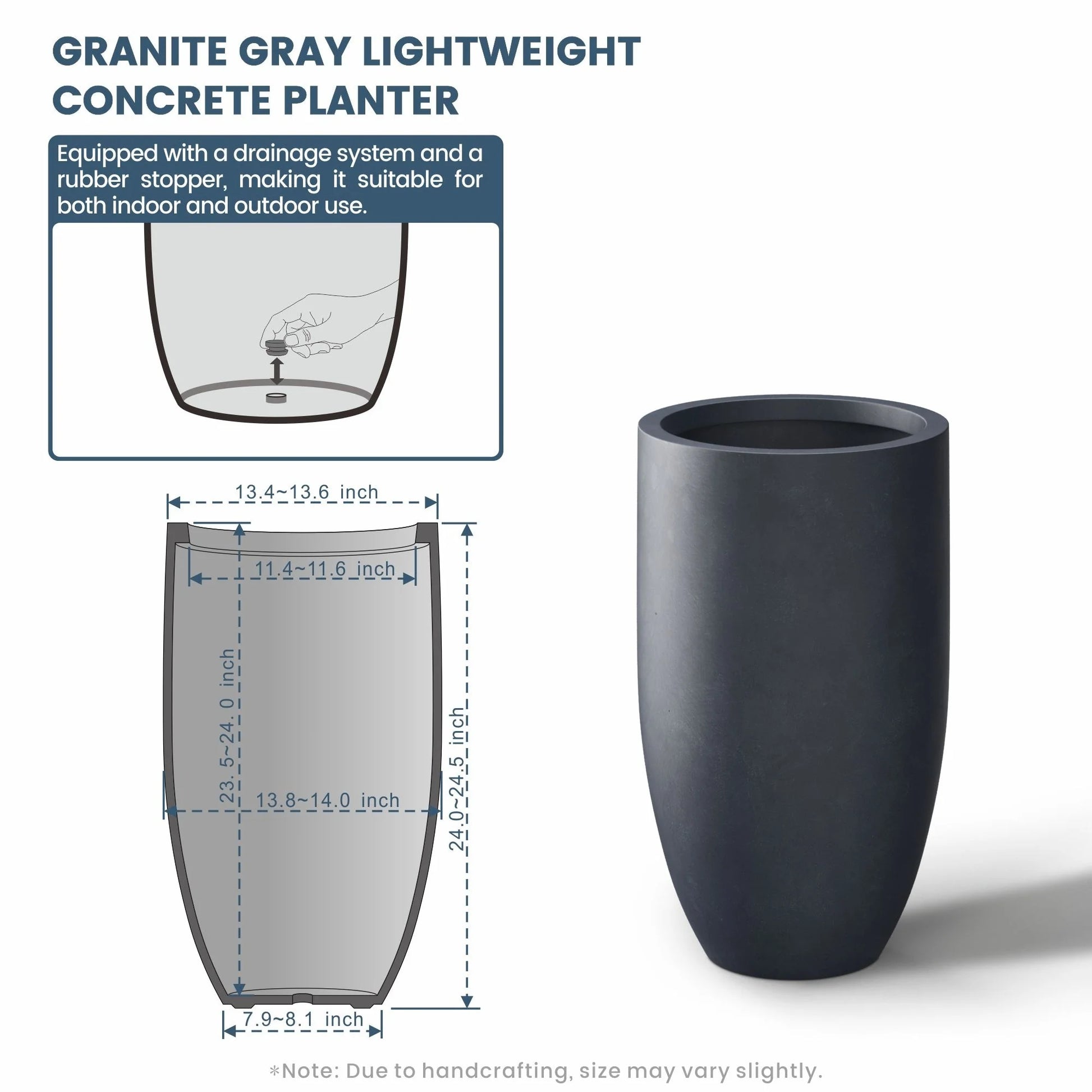 Textured Granite Gray Tall Concrete Round Plant Pots / Large Indoor and Outdoor flower Planters (13.5 Inch x 24.5 Inch)
