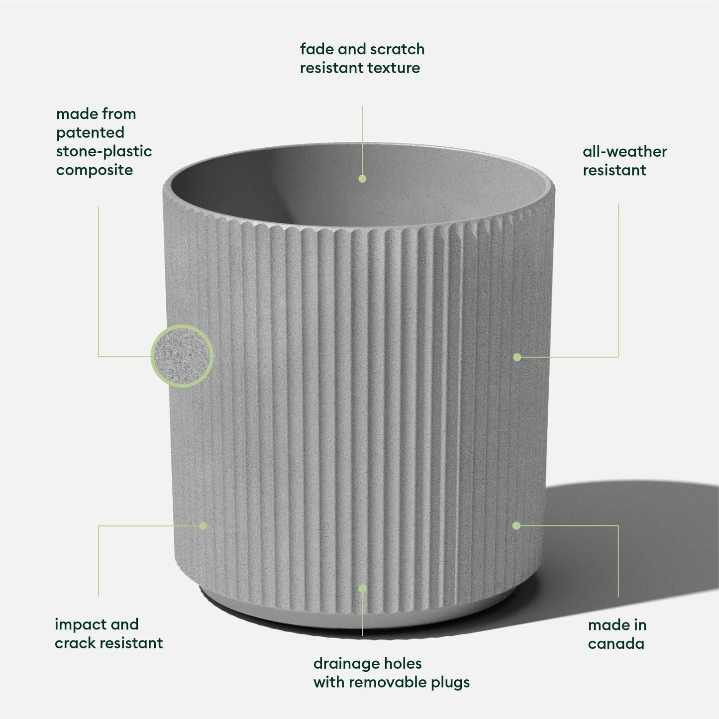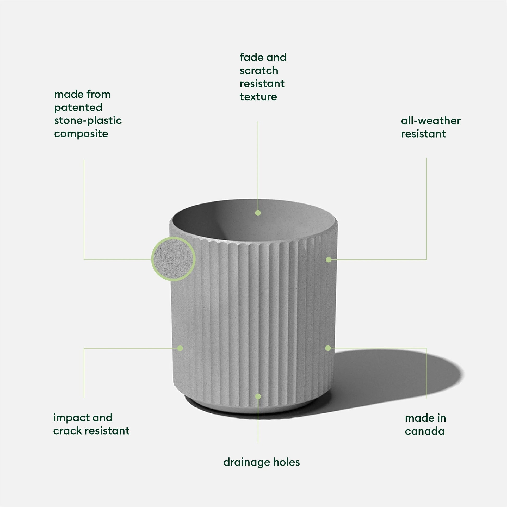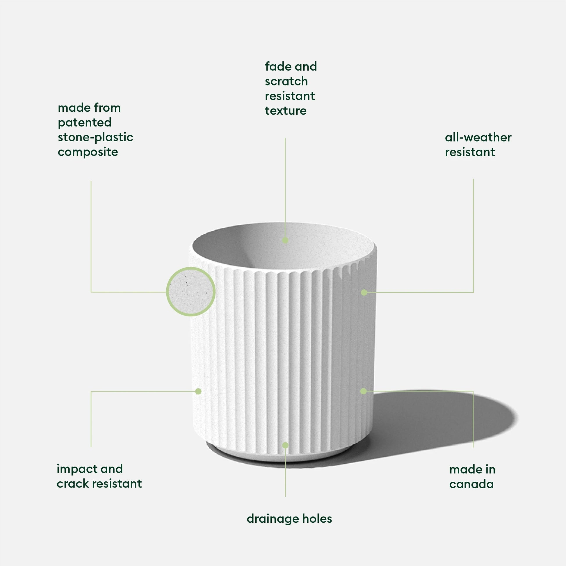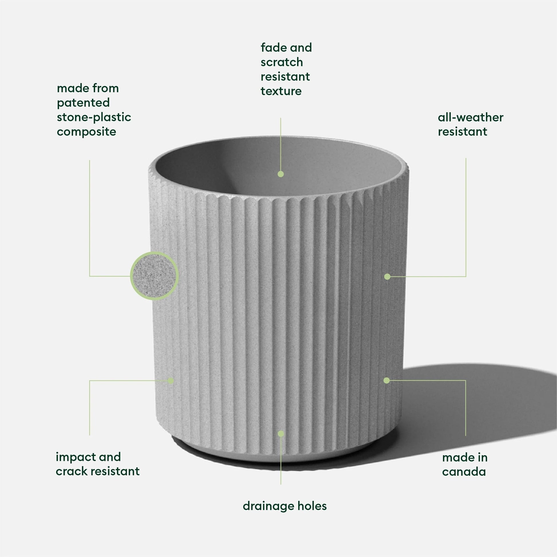 Inspired by traditional Roman columns, the fluted edges on the Veradek Demi Planter help to create a cozy indoor or outdoor space in the living room, patio or backyard. Pre-drilled drainage holes allow for planting a variety of different greenery such as trees, tall plants or flowers without having to worry about overwatering. This sturdy yet lightweight round planter is proudly crafted in Canada from a patented plastic-stone composite, making it resistant to cracks, fading and UV and allowing it to withstand extreme temperatures ranging from -20 to +120 degrees. With the ideal balance of design, structure and purpose, the Demi will add the finishing touches needed to transform a house into a home.