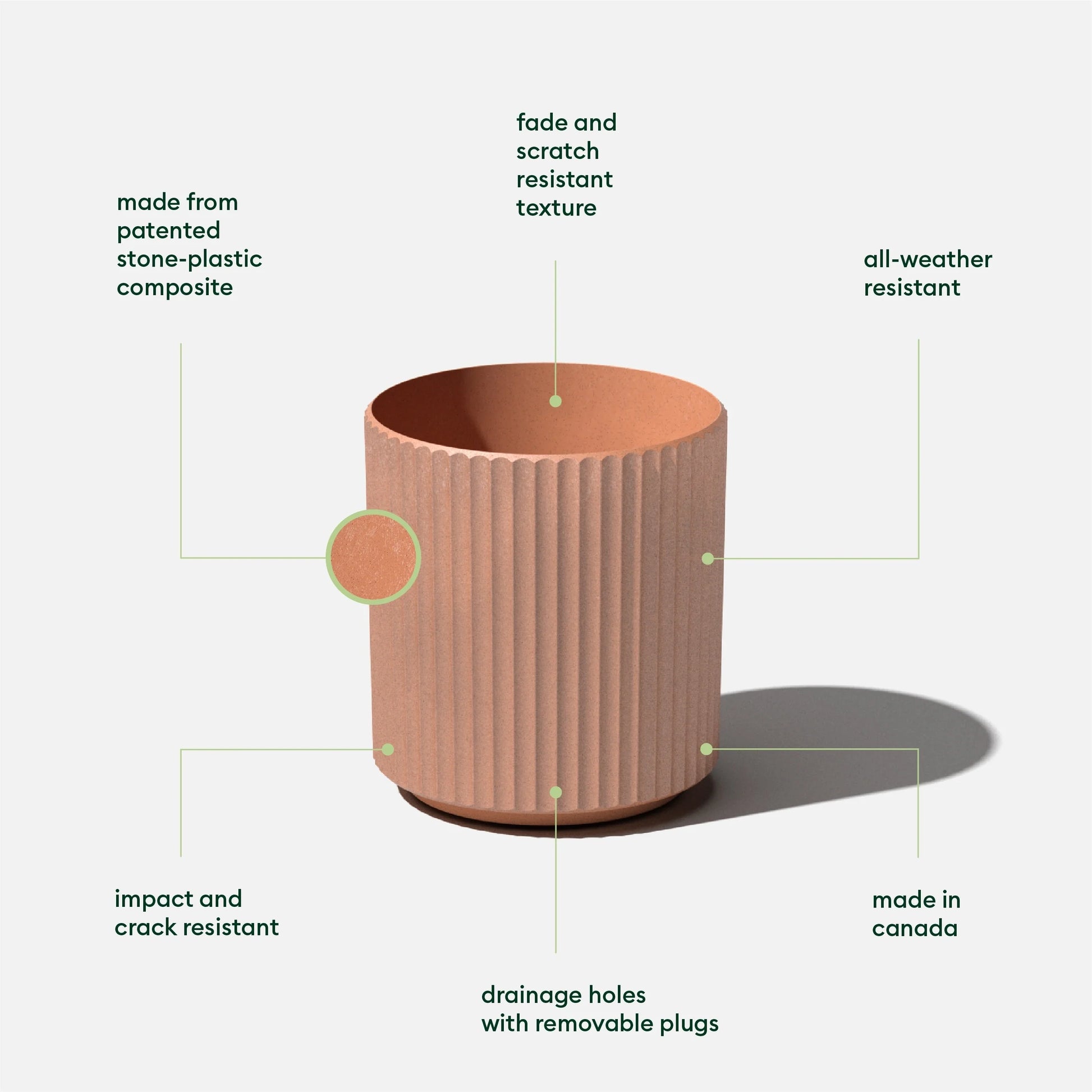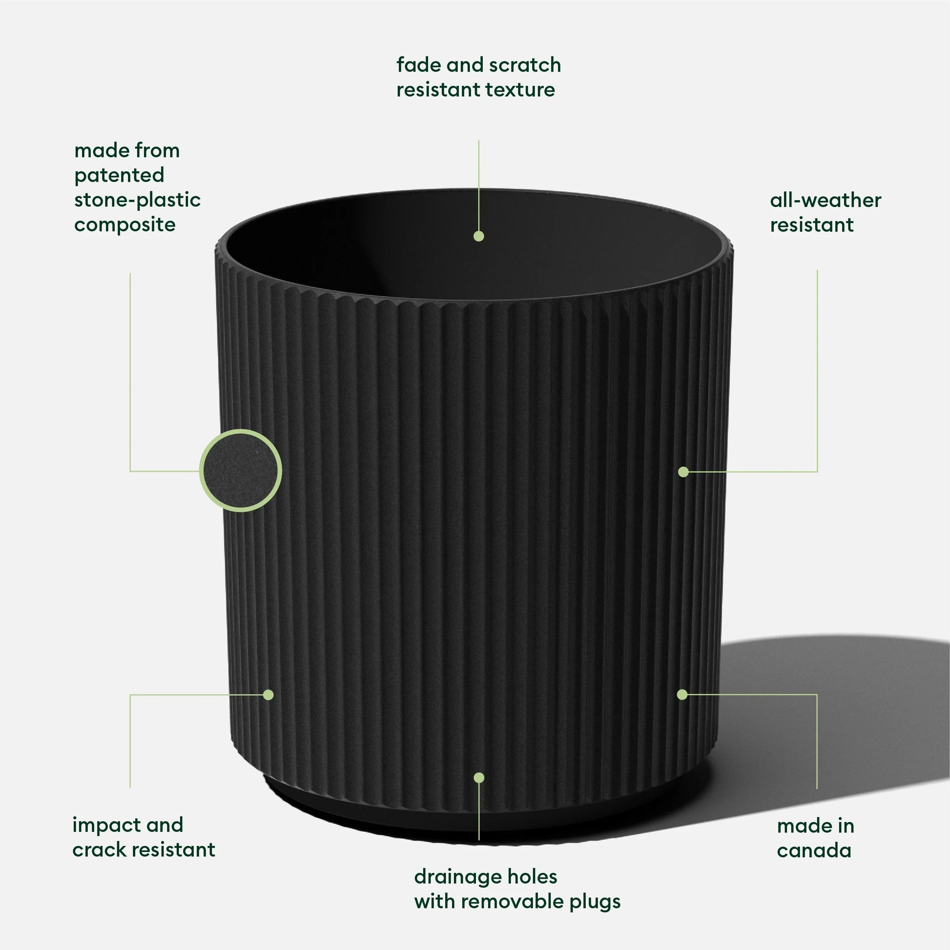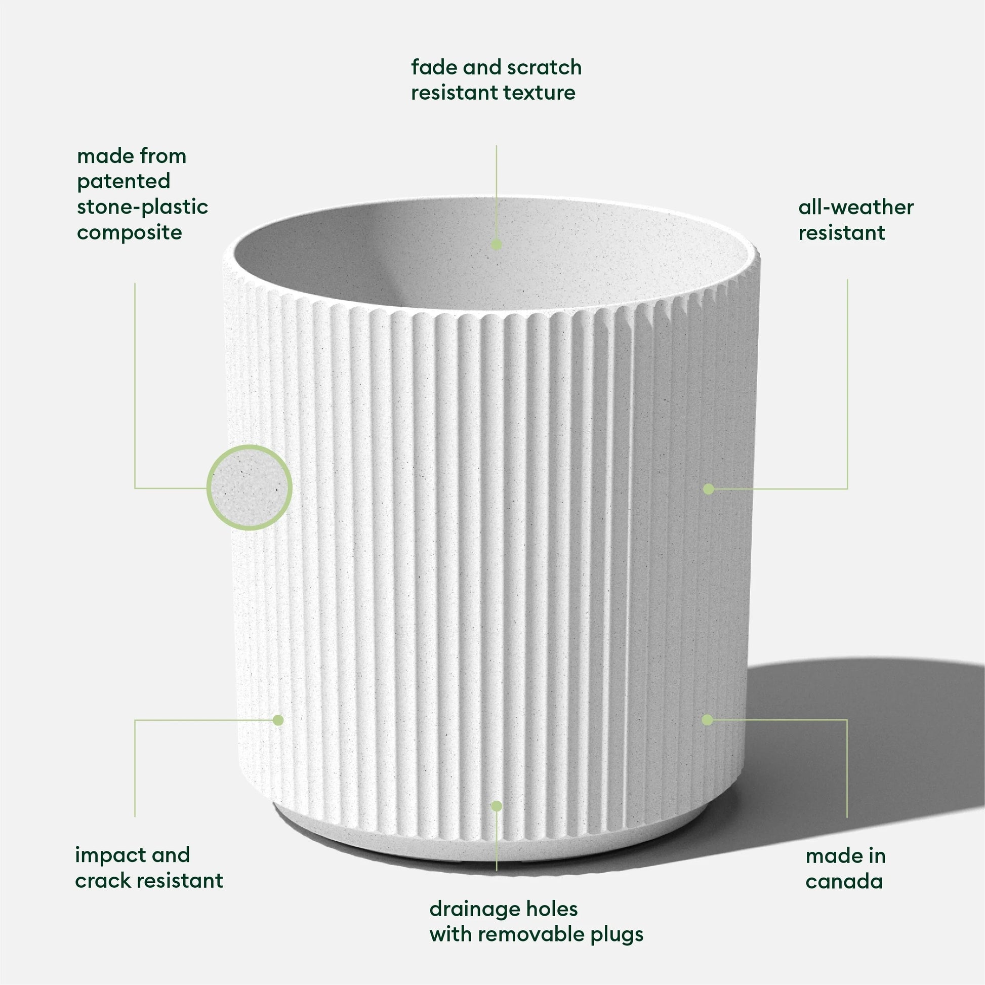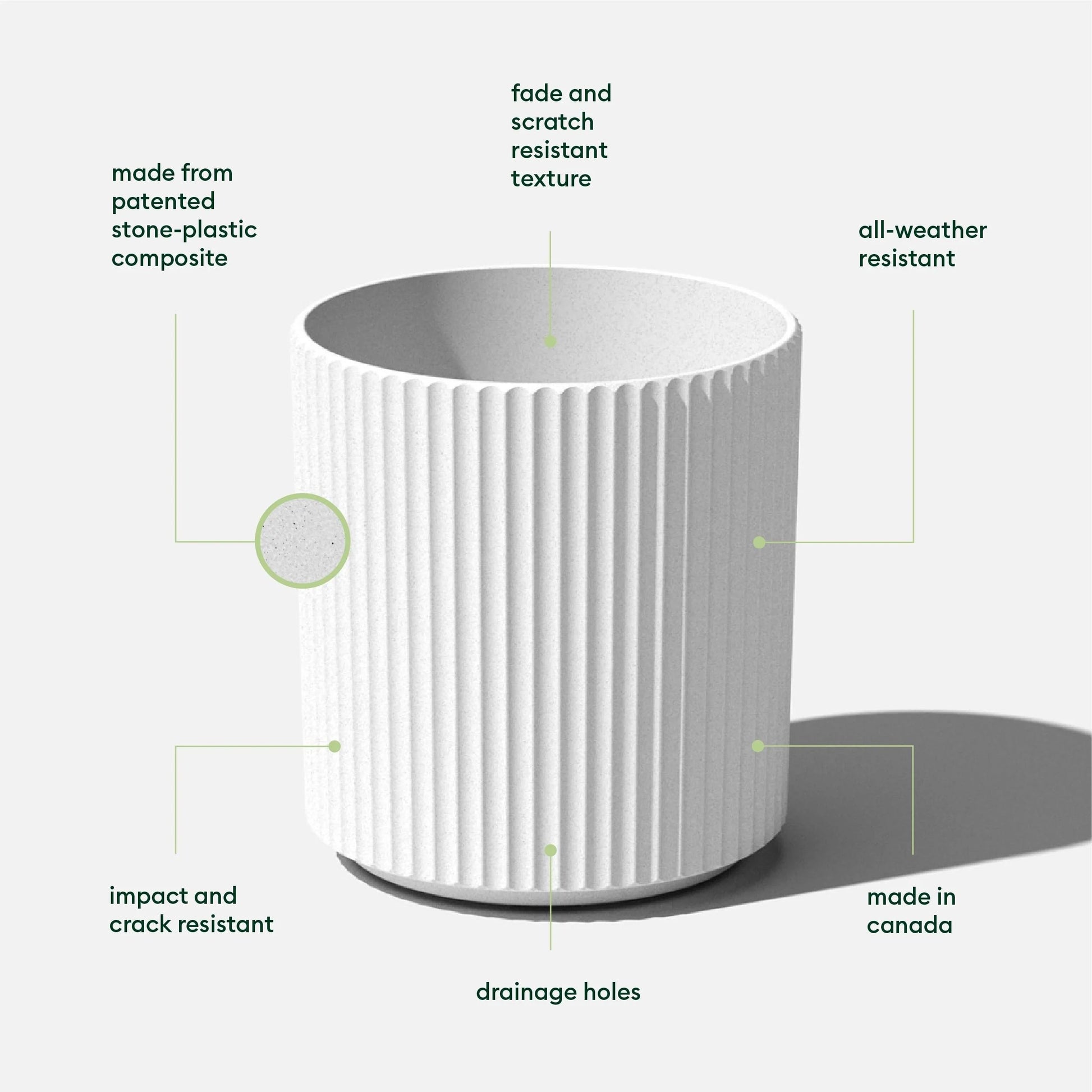 Inspired by traditional Roman columns, the fluted edges on the Veradek Demi Planter help to create a cozy indoor or outdoor space in the living room, patio or backyard. Pre-drilled drainage holes allow for planting a variety of different greenery such as trees, tall plants or flowers without having to worry about overwatering. This sturdy yet lightweight round planter is proudly crafted in Canada from a patented plastic-stone composite, making it resistant to cracks, fading and UV and allowing it to withstand extreme temperatures ranging from -20 to +120 degrees. With the ideal balance of design, structure and purpose, the Demi will add the finishing touches needed to transform a house into a home.