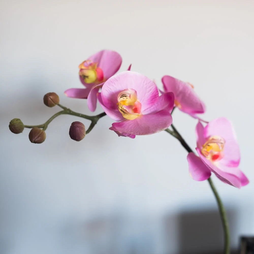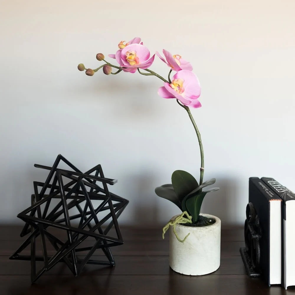 Vickerman 20" Artificial Lavender Orchid. This beautiful Orchid Features 4 Blossoms and comes Potted in a White Ceramic Container