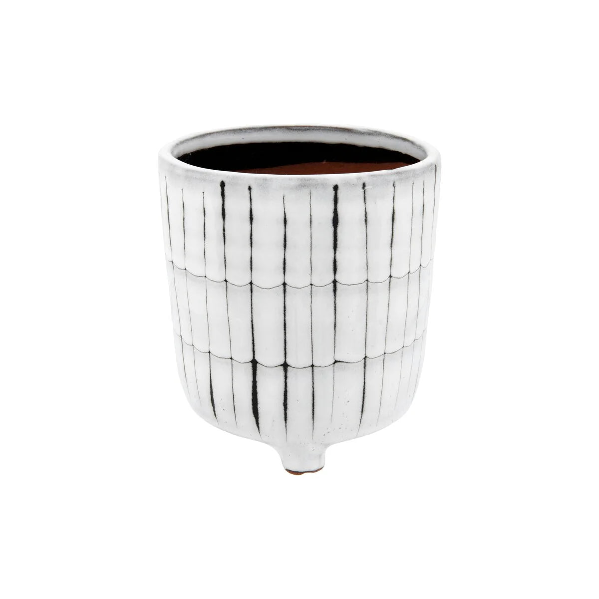 A statement is made with this white and black striped terra-cotta footed planter. This planter has a simple and elegant design that can complement any type of flowers or plants. The terra-cotta material has a natural and organic feel that contrasts with the white and black stripes that have a smooth and glossy effect. The stripes are hand-painted and have a vertical pattern that adds some height and movement to the planter. The planter has a round shape that can fit on any surface, such as a shelf, table, or mantel. The planter does not have drainage holes, so it is only for decorative purposes and not for holding water or live plants. It has four small feet that elevate the planter and add some dimension and interest to the design. The planter measures 5 inches in diameter and 5.75 inches in height, making it ideal for small to medium-sized plants such as succulents, herbs, or flowers. This white and black striped terra-cotta footed planter will make any home more stylish and attractive with its contemporary and geometric design.
