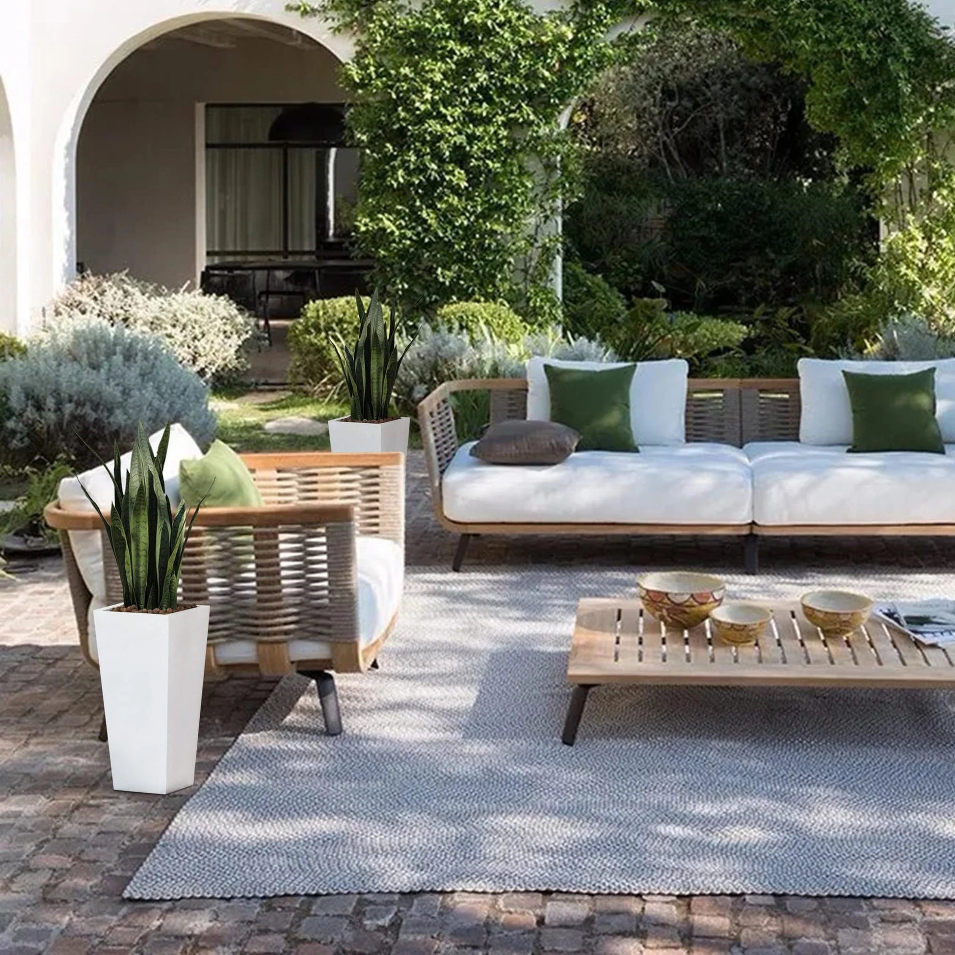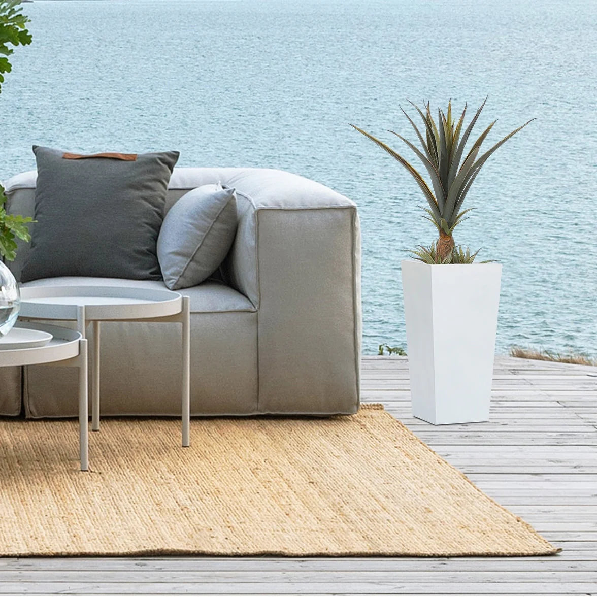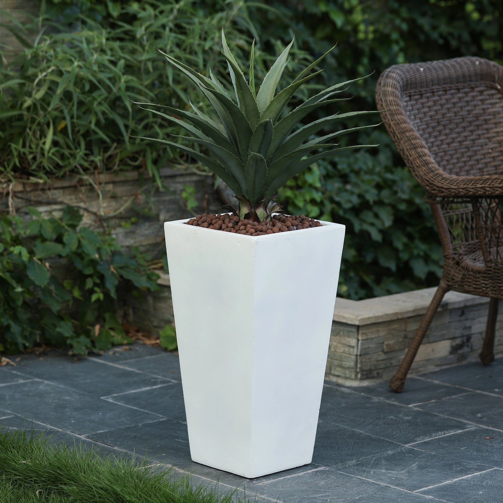 This tall and distinctive planter is the perfect addition to any front entrance. This design showcases a modern, sleek square tapered design, finished in a brilliant white perfect for the modern home. Designed to live outdoors, it is crafted from weather-resistant magnesium oxide material that does not mind UV light beaming down or rainstorms rolling through, and this planter is durable and designed for all seasons. The planter includes a drainage hole so you can avoid over watering your plant. It also includes a drainage plug, so you can place it indoors to freshen up your home as well! Whether on your porch, in your sun room or entryway, this planter is the perfect complement to your style!