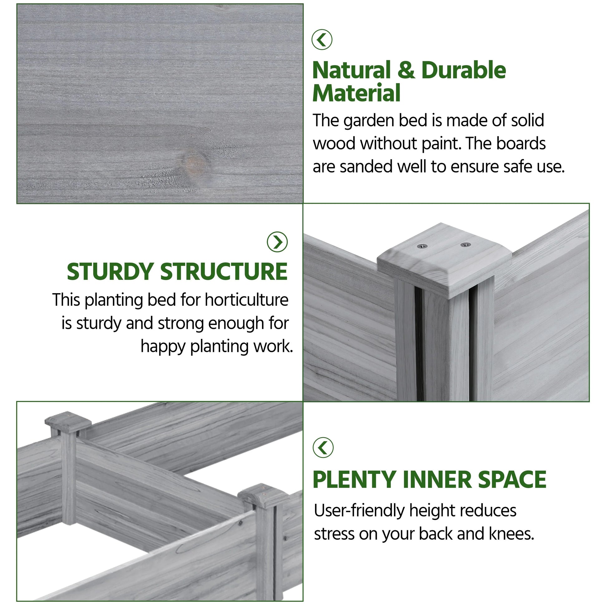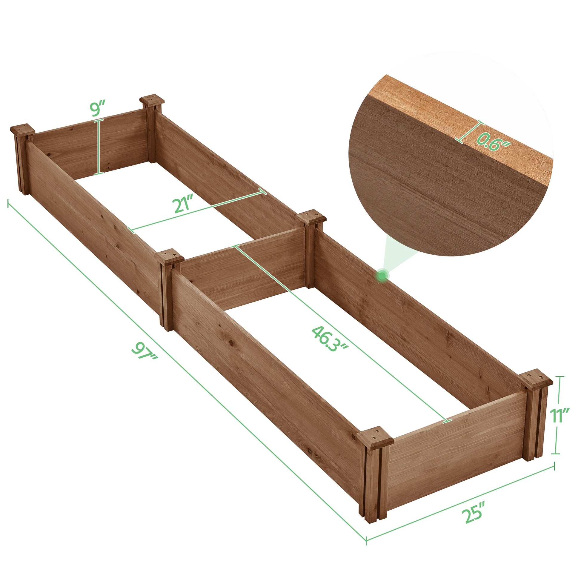 Create your dream garden with Yaheetech's Wooden Raised Garden Bed Planter Box. Made from solid, natural wood and sanded to be smooth, this planter box features tetrahedral interlocking joints for a tight and stable frame. With two separate growing areas that can be combined into one, this garden bed is perfect for cultivating vegetables, flowers, or herbs in your yard, garden. The open bottom design promotes healthy plant growth while the decorative end caps and natural wood grain give a rustic look to your garden.